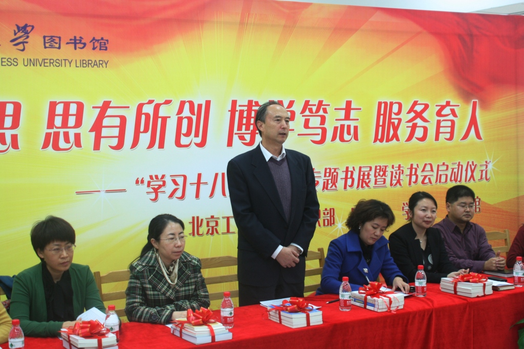 為認真貫徹落實“十八大”會議精神、熱情謳歌黨的光輝業績、加快推進學習型基層黨組織建設、引導師生多讀書、讀好書, 11月20日下午,圖書館在阜成路校區舉行了以“讀有所思、思有所創、博學篤志服務育人”為主題的“學習十八大精神”專題書展暨讀書會啟動儀式。學校黨委副書記盧思鋒、組織部部長兼機關黨委常務副書記董竹娟、宣傳部部長張春萍、學生處處長呂素香、組織部副部長兼機關黨委副書記鄭喜姣、圖書館全體共產黨員及學生代表參加了啟動儀式。儀式由圖書館黨支部書記李艷芬主持。
