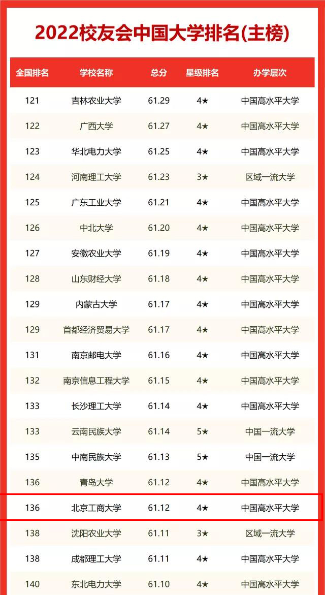 學校位列2022校友會中國大學排名第136位