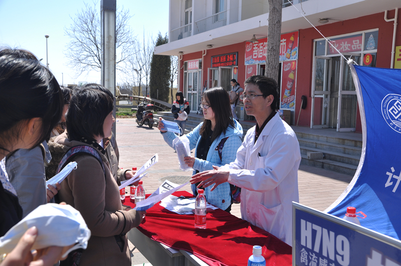學校醫院樊國升大夫現場提供健康咨詢服務,學生咨詢了大家關心的問題:“能不能吃雞肉?”、“別的動物會不會也感染禽流感,會不會有危險?”、“最近感冒咳嗽吃什么藥比較好?”等。樊大夫給予了耐心的講解和回答,解釋了吃煮熟的雞肉和雞蛋都是對健康沒有影響的;截至目前人與人沒有病毒的傳染,不必過于恐慌:感冒要分清癥狀,及時到校醫院診治,不要亂用藥。學校醫院還為大家提供了口罩,計信學院的學生一邊發放口罩一邊向大家講解口罩的正確使用方法,并告訴大家要盡量避免去人多擁擠的地方,如果開展集體春游要盡量佩戴口罩。12日計信學院還將與校醫院聯合在阜成路校區開展預防禽流感相關活動。