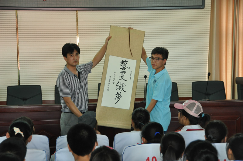 實(shí)踐團(tuán)組織夏令營(yíng)學(xué)生召開(kāi)了“新生見(jiàn)面會(huì)”,加深了實(shí)踐團(tuán)與中學(xué)生的認(rèn)識(shí)與了解,介紹了夏令營(yíng)期間即將開(kāi)展的各項(xiàng)活動(dòng)。藝傳學(xué)院李大壯同學(xué)代表實(shí)踐分團(tuán)將其書(shū)法作品“藝夏織夢(mèng)”贈(zèng)予石窩中學(xué),表達(dá)了實(shí)踐分團(tuán)與石窩中學(xué)友好合作,共度美好夢(mèng)想之夏的愿望。
