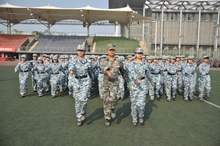 下午,在同學們拍照留念后,繼續進行了緊張的訓練。軍訓已經過半,訓練有了明確的部署與分配:行進式、警盾操、軍體拳等,其中最主要的是方陣訓練。從方陣的隊形、步伐、姿勢以及聲音等方面可以折射出參訓同學的努力程度以及吃苦耐勞的精神。