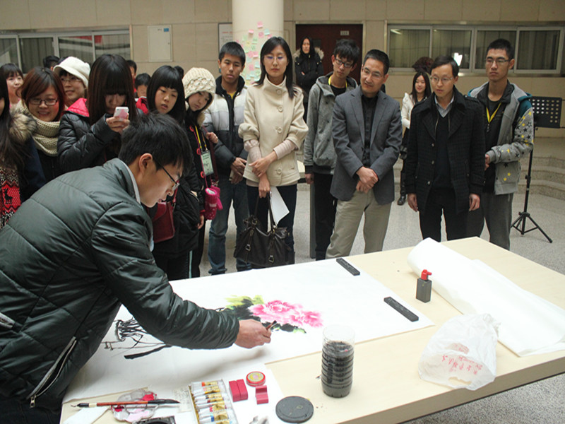 學(xué)院4名同學(xué)的現(xiàn)場才藝展示是開幕式的亮點(diǎn)。伴隨著琴笛合奏的《雨碎江南》悠揚(yáng)樂聲,兩位同學(xué)現(xiàn)場揮毫創(chuàng)作出了蒼勁有力的書法作品和清新淡雅的水墨畫,令在場的師生為之嘆服。