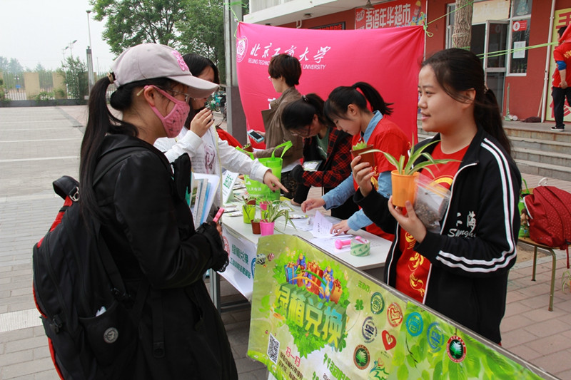 此次活動由我校商學院與北京理工大學延河之星志愿服務總隊、首都師范大學愛心接力社和綠芽公益文化交流中心共同舉辦,在同一時間分別在學校良鄉校區、北京理工大學良鄉校區、首都師范大學良鄉校區三地開展環保宣傳活動。此次“綠色兌換·綠陽盈窗”活動共分為兩個部分:綠植兌換與結緣綠植。其中,第一部分為活動的主體,同學們以廢舊塑料瓶與廢紙為兌換載體兌換新鮮的綠色植物。第二部分,通過領養相同編號的綠色植物種子讓三所大學的同學互相溝通,增進友誼。
