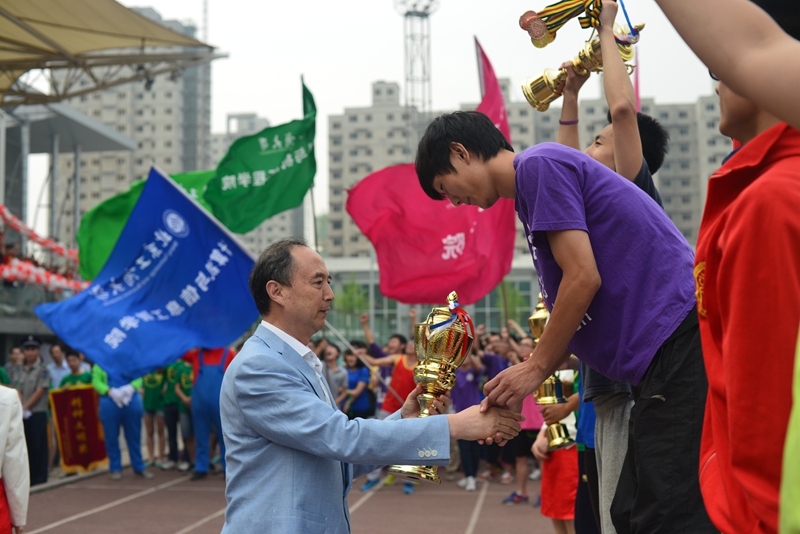 在閉幕式講話中,盧思鋒副書記指出,本屆運動會在全體師生和各有關部門共同努力下取得了圓滿成功,其中,與往年相比第一次冒雨參賽,更加體現了運動員的體育運動精神和裁判員的公平公正;第一次使用了由藝傳學院學生設計的獎牌,第一次使用了電子計時器和航拍的手段等,在創意、技術手段等方面開創先河。盧思鋒對全體參賽運動員、參與開幕式表演的全體學生和千名教職工表演廣播操,帶頭踐行體育精神提出表揚,并感謝所有為運動會的組織、裁判和競賽做出貢獻的工作人員和和服務保障人員。他特別提到,在師生的努力籌備、積極訓練下,全體大一女生在我校歷史上第一次實現了千人熱力操的表演,在體能、體質和意志上得到了鍛煉;心理素質表演中五百多名學生自編自導的竹竿舞、五環繩圈表演等節目表演都非常精彩,具有獨創性,將舞蹈和體育精神融合,展現了大學生團結進取的精神風貌。盧思鋒提出,希望同學們堅持積極開展體育鍛煉,增強身體素質,德智體美全面發展;希望在不久的將來實現與外國學生同場競技的設想,把北京工商大學的運動會辦得更加高端化、國際化;希望同學們共同努力,努力學習、各展所長。