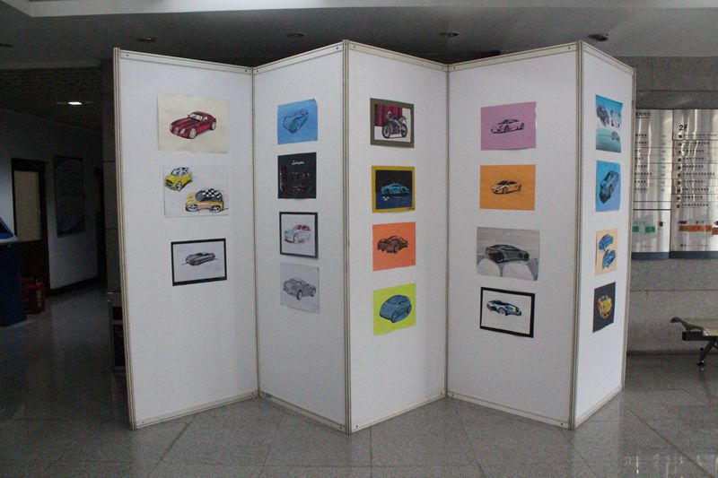 本次展出的作品是從工設12級學生的數百幅作業中挑選出來的優秀作品,作品種類豐富,其中有草圖也有最終效果圖,有材質表現也有結構表現,有平面多視圖也有透視圖,作品內容有小家電也有交通工具,全面展示了同學們對表現技法的掌握。色彩斑斕形式多樣的作品吸引了眾多師生駐足觀看。