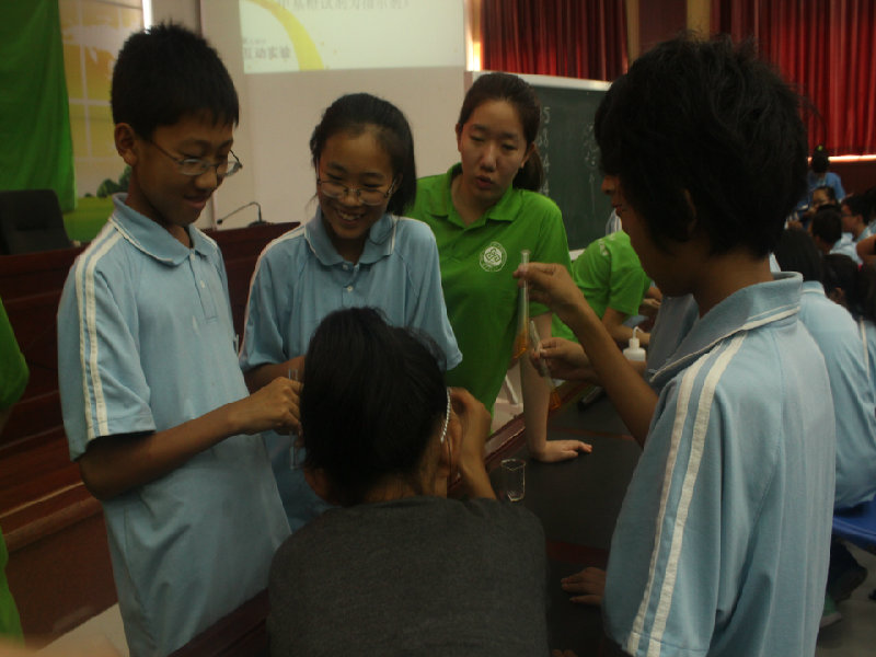 下午第二節是同學們最為期待的化學實驗課。由于低年級學生并沒有接觸過化學。小老師們便由淺入深,提出如可樂為什么會有氣泡、如何除水垢等問題吸引大家,在一問一答間令課堂上一片歡聲笑語,接著,老師們又拿出儀器,指導同學們親手操作。