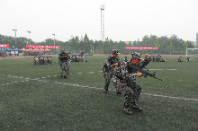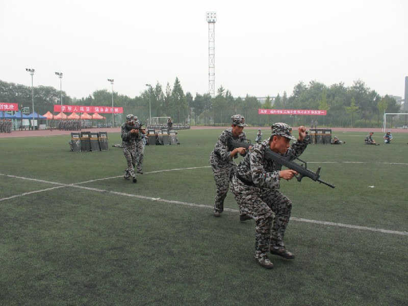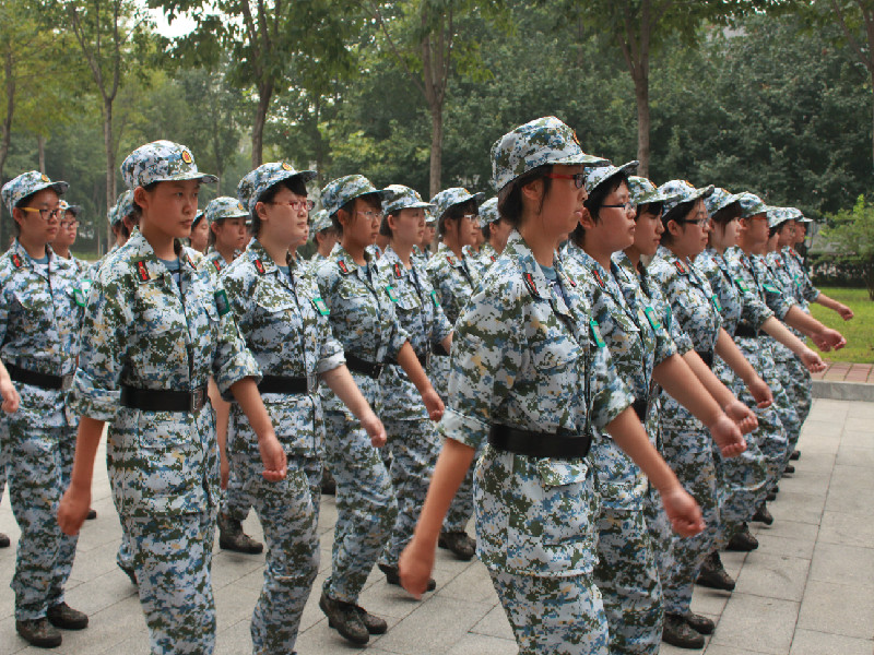 操場上的草地與新生身上的迷彩軍裝相互輝映,使新生們顯得活力十足。五營的男生們有的進行表演科目訓練,有的進行隊列訓練。教官們不僅嚴格要求,更時不時親自示范,并手把手糾正基本動作,同學們在教官的帶領下認真訓練,絲毫沒有半點偷懶,操場上時常可以聽見新生們響亮的口號聲。與此同時,五營的女生們正在進行緊張的隊列訓練,伴著分列式背景音樂,同學們不斷調整步伐,確保跟上音樂的節拍,達到整齊劃一的效果。放眼望去,那整齊的步伐,筆直的站姿,堅定的面容,炯炯的眼神,鏗鏘的歌聲……無不顯示出十余日刻苦訓練所帶來的成果。
