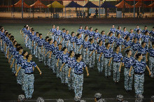 晚上,懷著激動的心情,同學們迎來了匯報演出前的合練彩排。步伐整齊的列兵式結束后,最有意思的特色匯報開始,作為第四個上場的匯報項目,方陣中的同學們既緊張又興奮。匯報表演并不完美,但是與昨天相比已經有了明顯的進步。場上同學們的吼聲響徹操場,眼神堅定自信,漂亮的隊列變幻贏得了在場的陣陣掌聲。
