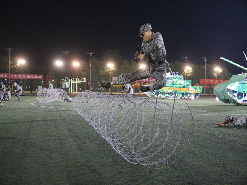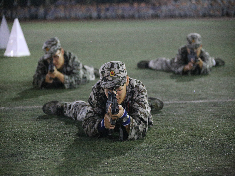 晚上閱兵式的演練仍在繼續(xù)著,同學們已從最初對流程的陌生變?yōu)閷⒚總€動作熟記于心。迎著習習秋風,他們踏著堅定的步伐前行著,一次次地與音樂進行協(xié)調,希望在每個環(huán)節(jié)上都做到盡善盡美。緊接著便是各項軍事訓練科目彩排,我們?yōu)橛嬓湃隣I隊列的整齊劃一鼓掌吶喊,為匍匐前進的勇往直前熱血沸騰,為每一次行動的威武雄壯感到無比震撼。興奮之余,大家也深刻地領會到了軍訓的意義與魅力:團結一致,奮發(fā)向上,熱情如火,士氣雄壯。每一位新生的青春,早與那綠色的迷彩融為一體。響亮的口號,展示了同學們對未來的信心;整齊矯健的步伐,編織出精彩絢爛的今天;艱苦勞累的軍訓,鑄成了軍人的體魄。