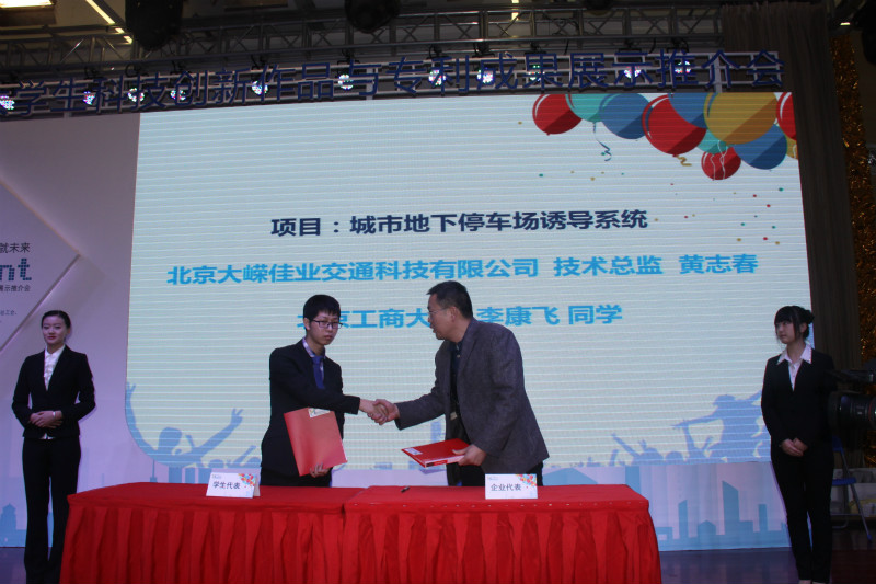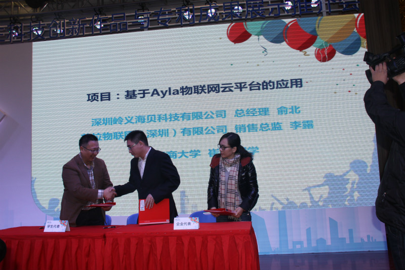 我校學生李康飛代表課題組和北京大嶸佳業(yè)交通科技有限公司就“城市地下停車場誘導系統(tǒng)”課題現(xiàn)場簽訂了合作意向書。我校學生代表崔健和深圳嶺以海貝科技有限公司、艾拉物聯(lián)網(wǎng)(深證)有限公司就“基于Ayla物聯(lián)網(wǎng)云平臺的應用”進行了現(xiàn)場簽約。這兩項作品憑借大膽創(chuàng)新、精確的結(jié)構(gòu)設計及以人為本的設計理念,贏得了相關企業(yè)和專家的好評。