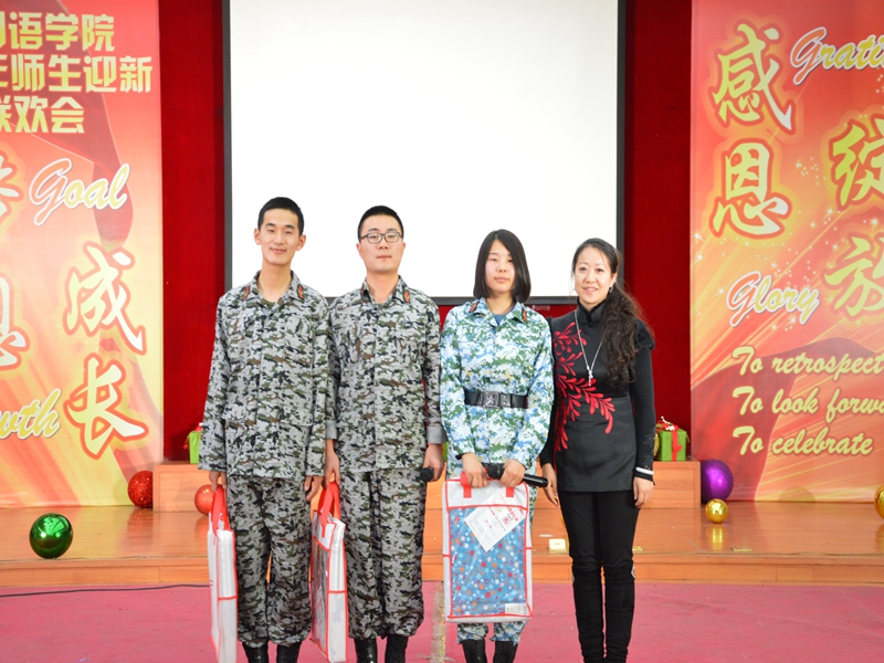 劉紅艷代表學(xué)院為退伍大學(xué)生士兵贈(zèng)送禮物,對他們表達(dá)了美好祝愿,希望他們盡快重新融入外國語學(xué)院的溫暖大家庭;她鼓勵(lì)學(xué)院全體同學(xué)要總結(jié)經(jīng)驗(yàn),樹立理想,在新的一年以實(shí)際行動(dòng)追求夢想。羅朝能在新年致辭中強(qiáng)調(diào)學(xué)院一年來在專業(yè)學(xué)科建設(shè)與教學(xué)綜合改革方面取得的成果,表示學(xué)院將不斷加強(qiáng)商務(wù)英語學(xué)科建設(shè),充分利用英語教學(xué)平臺(tái)與國際合作平臺(tái),增強(qiáng)學(xué)生專業(yè)優(yōu)勢,擴(kuò)大實(shí)習(xí)渠道,并祝愿學(xué)院全體師生在新的一年取得更大進(jìn)步。