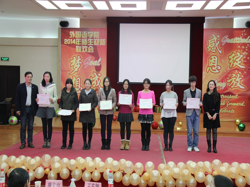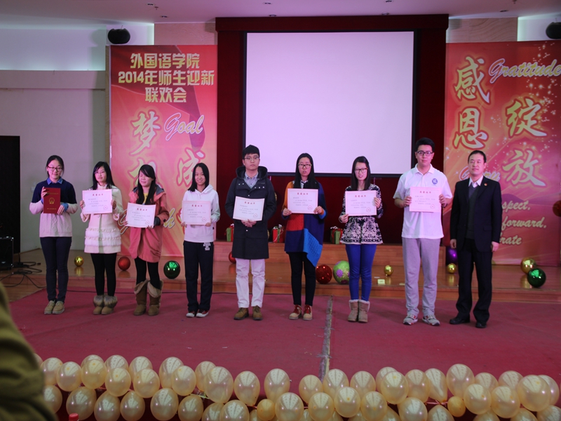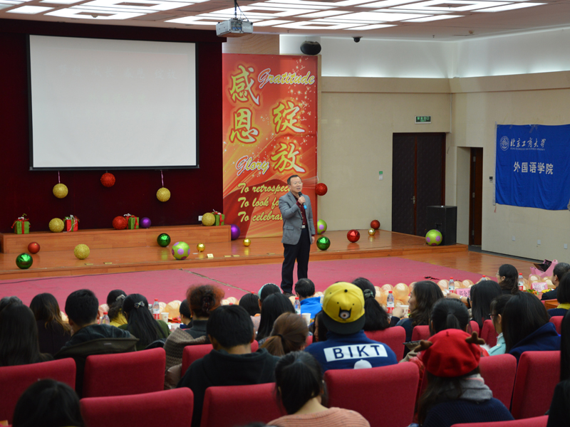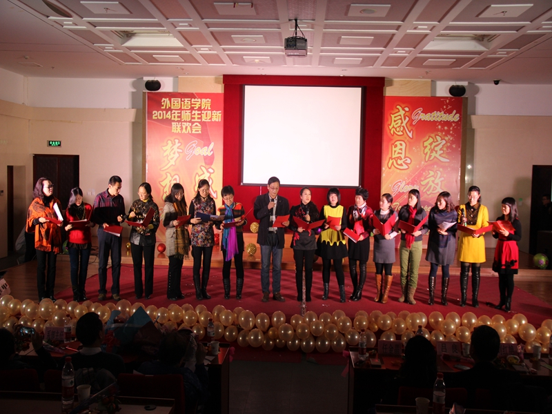 12月24日,外國語學(xué)院以“夢想、成長、感恩、綻放”為主題在良鄉(xiāng)校區(qū)舉辦2014年師生迎新總結(jié)會(huì),回顧過去一年同學(xué)們的成長歷程,表彰先進(jìn)集體與個(gè)人,總結(jié)學(xué)院師生取得的豐碩成果。校紀(jì)委書記邱曉平出席并講話。團(tuán)委書記呂良,外國語學(xué)院院長羅朝能、黨總支書記劉紅艷、副院長苗天順、黨總支副書記任金晶及全體專業(yè)教師、導(dǎo)師、班主任以及學(xué)院全體同學(xué)參加了活動(dòng)。