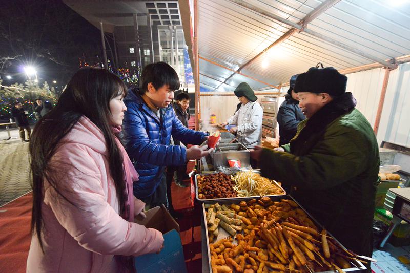 文體館前的小吃街則是師生們每年“牽腸掛肚”的項(xiàng)目之一,在歡笑過后享受不同美食是一種幸福。為了此次小吃街的順利開業(yè),學(xué)校餐飲部門的工作人員很早便開始了各項(xiàng)準(zhǔn)備工作。賣羊肉串的大叔介紹,“我們提前一個(gè)星期就將所有東西準(zhǔn)備好了,每天都加班在做著準(zhǔn)備。”晚會(huì)落下帷幕,小吃街也漸漸地?zé)狒[了起來,盡管當(dāng)天降溫,室外溫度只有零下幾度,但這絲毫低擋不住美食的誘惑,每個(gè)攤子前都站滿了同學(xué),手拿著各式小吃,形成了一道獨(dú)特的風(fēng)景線。