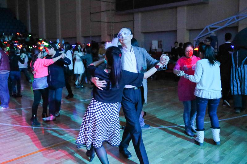 在跨年舞會(huì)上共同迎接2015年的到來,將這一夜的精彩推向更高潮。優(yōu)雅的華爾茲、特色的民族舞、歡快的熱舞勁舞,隨著音樂的響起,同學(xué)們紛紛被現(xiàn)場(chǎng)的氣氛所感染,緩緩滑入舞池,身體開始跟著節(jié)奏律動(dòng)起來。鍋莊舞是藏族的民間舞蹈之一,也是學(xué)校跨年舞會(huì)的保留節(jié)目,深受大家歡迎。今年的舞會(huì)上,數(shù)十位身著藏族服裝的同學(xué)帶著大家一起跳起了鍋莊舞,大家拉手成圈,輪班唱和,甩腳踏步,齊聲喊“亞”,將舞會(huì)掀起陣陣高潮。“我們希望能用自己的舞蹈活躍氣氛。”其中一位藏族同學(xué)羅布措姆開心的說道。全場(chǎng)的同學(xué)伴隨著不同音樂的變換,改變的是各種舞姿,不變的是所有師生的無限歡樂。