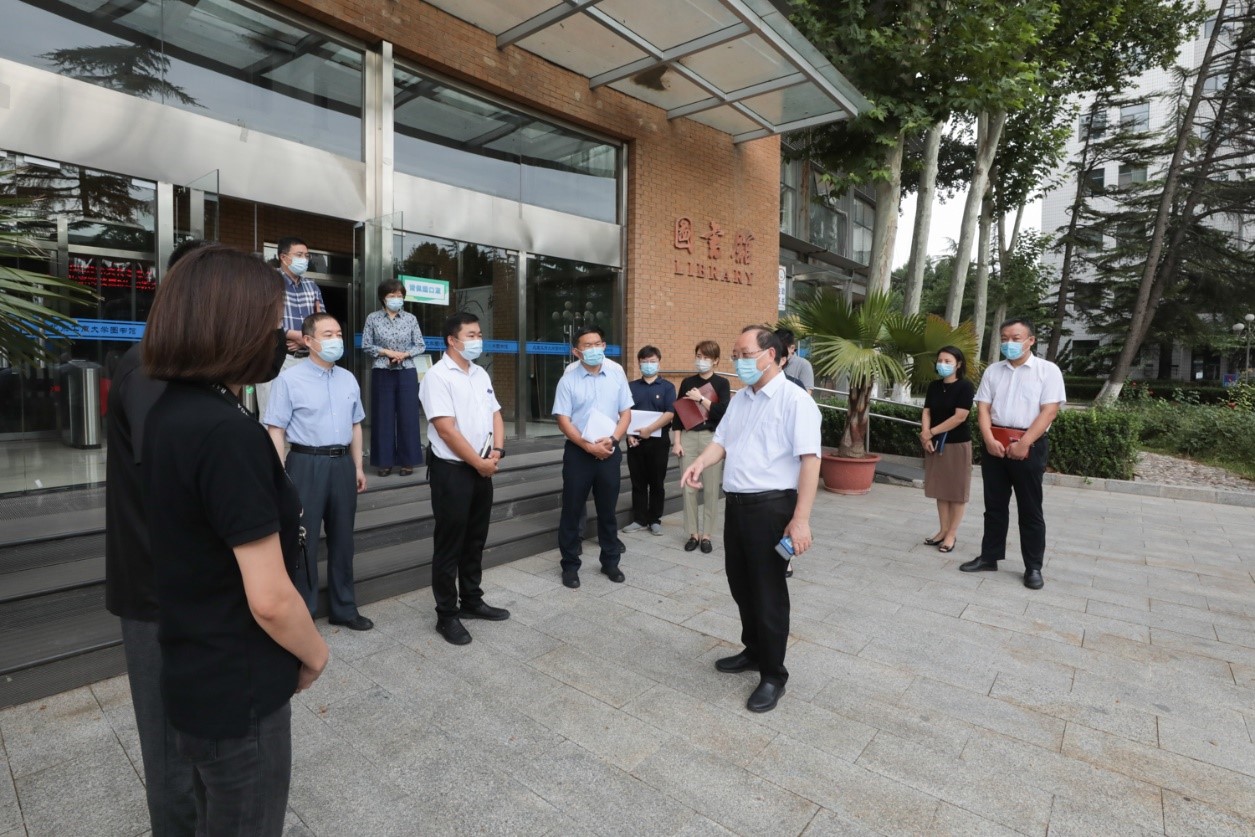 黃先開(kāi)一行先后實(shí)地檢查了阜成路圖書(shū)館、西區(qū)核酸采樣點(diǎn)、西區(qū)操場(chǎng)、教三樓、東西校區(qū)校門(mén)等防疫關(guān)鍵點(diǎn)位。在圖書(shū)館對(duì)學(xué)生出入、預(yù)約占座、應(yīng)急處置等情況進(jìn)行實(shí)地查看,強(qiáng)調(diào)圖書(shū)館是人員密集場(chǎng)所,要堅(jiān)決擔(dān)負(fù)起防疫主體責(zé)任,認(rèn)真落實(shí)各項(xiàng)防控措施。在教一樓核酸采樣現(xiàn)場(chǎng)查看了核酸檢測(cè)采樣情況、并看望慰問(wèn)了一線醫(yī)護(hù)人員和黨員志愿者。在西區(qū)操場(chǎng),對(duì)新生開(kāi)學(xué)典禮準(zhǔn)備工作提出要求,典禮現(xiàn)場(chǎng)要落實(shí)一米間隔防疫規(guī)定,督促師生現(xiàn)場(chǎng)佩戴好口罩,確保開(kāi)學(xué)典禮順利舉行。在教三樓教室改造施工現(xiàn)場(chǎng),查看了施工現(xiàn)場(chǎng)疫情防控情況及改造進(jìn)展,強(qiáng)調(diào)要統(tǒng)籌兼顧疫情防控和施工質(zhì)量,在落實(shí)疫情防控的前提下加快推進(jìn)施工進(jìn)度,通過(guò)教室改造營(yíng)造校內(nèi)良好學(xué)習(xí)氛圍。在東西區(qū)的大門(mén)處,詳細(xì)查看了入校人員查證、掃碼、測(cè)溫的執(zhí)行情況。