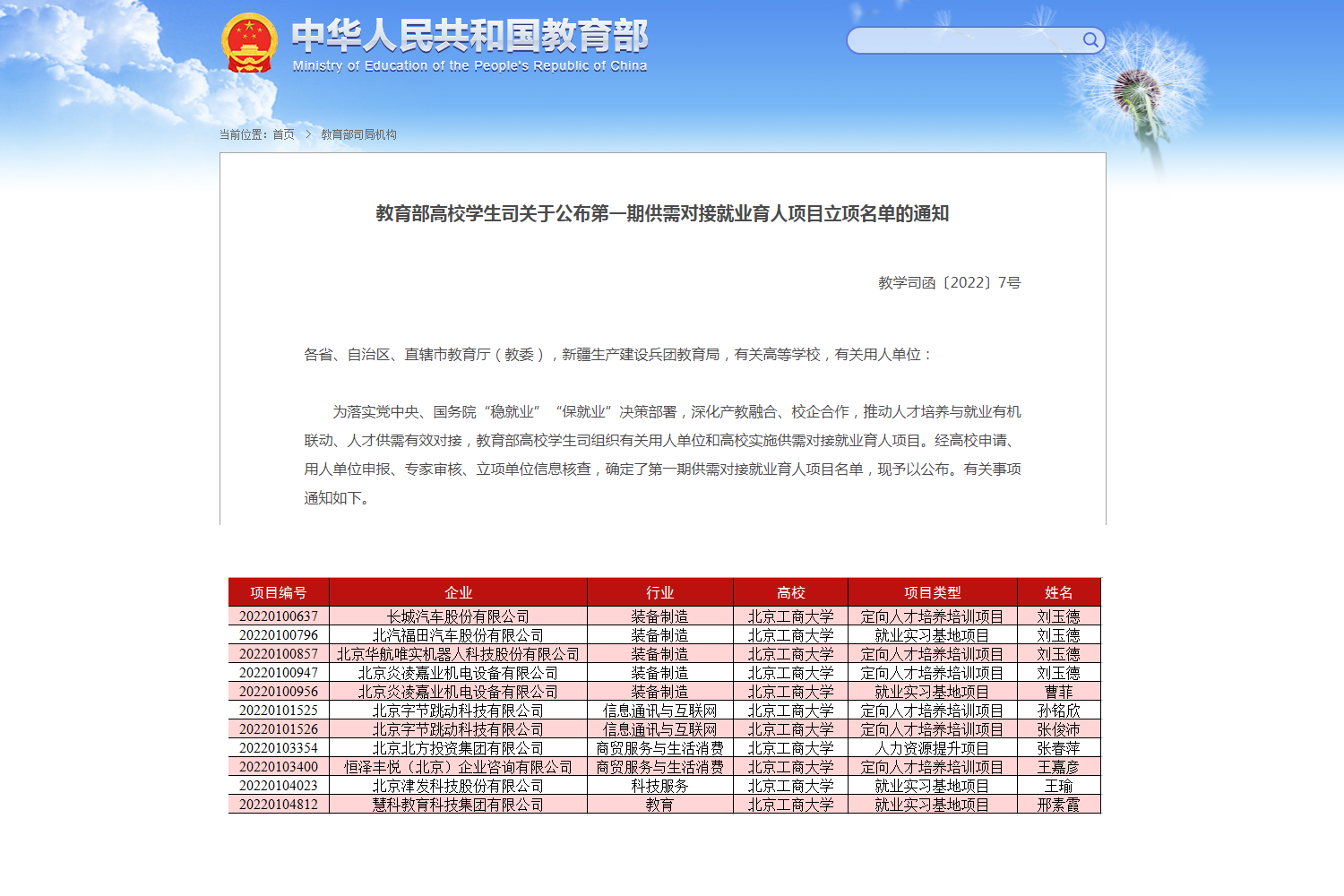 為落實黨中央、國務(wù)院“穩(wěn)就業(yè)”“保就業(yè)”決策部署,深化產(chǎn)教融合、校企合作,推動人才培養(yǎng)與就業(yè)有機聯(lián)動、人才供需有效對接,教育部高校學(xué)生司組織有關(guān)用人單位和高校實施供需對接就業(yè)育人項目。經(jīng)高校申請、用人單位申報、專家審核、立項單位信息核查,確定了第一期供需對接就業(yè)育人項目名單。