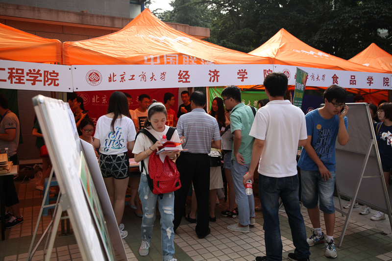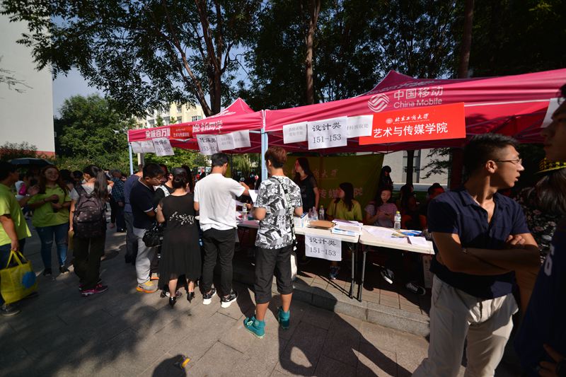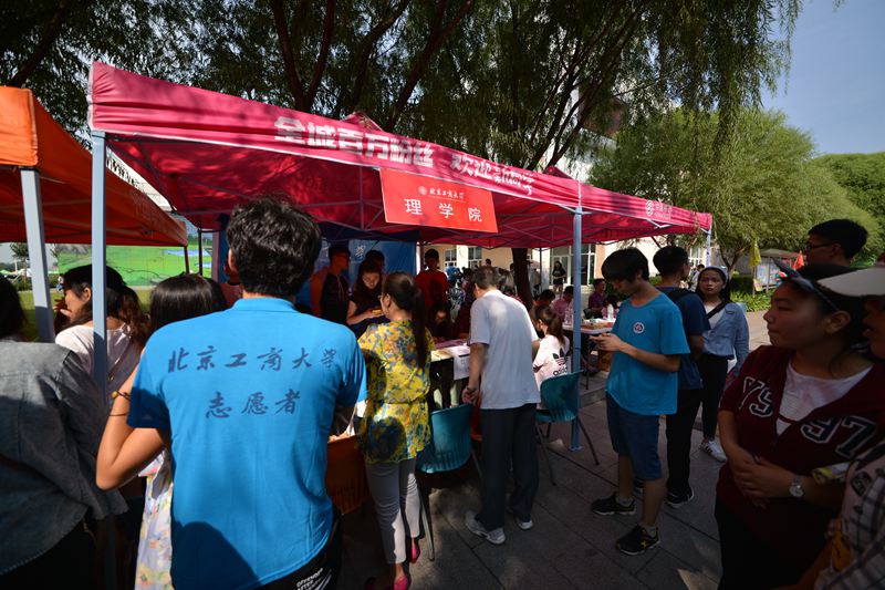 一大早,各部門、各學院的負責人、老師及學生志愿者們便來到現場,為迎接新生們做好充足準備。理學院將化妝品專業學生自制的化妝品供新生試用;食品學院懸掛的標語“Young在工商 Hold住夢想”別樣新穎;計信學院將報到流程圖文并茂地印刷在展板上方便新生快速辦理;材料學院的班主任們全勤到崗,耐心細致地向新生和家長介紹專業特色和專業方向;經濟學院高年級的學生最早到達招新現場開始布置;身著商學院院服的志愿者遍布良鄉校區生活區東門到迎新點的每一個岔路口,將商院紅燃到了商學院每一個新生的心中;法學院迎新處張貼了學生手繪的“良鄉校區導航圖”,并提前對迎新人員進行了三次培訓以便提供更加優質的服務;外國語學院則以“歡迎、完美、溫暖”為主線開展迎新活動;藝傳學院總計安排近30位老師參與迎新,并印制入學前兩天的時間安排表,讓學生更清晰地了解學院安排。