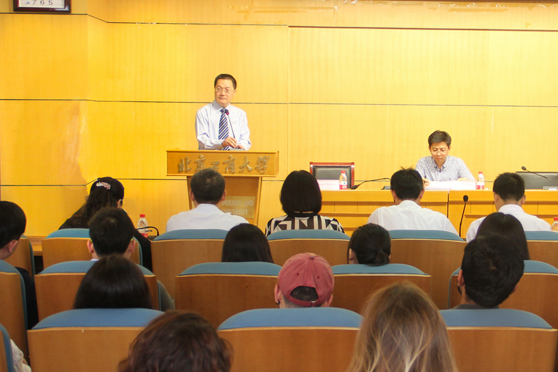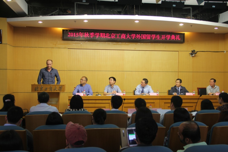 商學(xué)院副院長楊浩雄作為學(xué)院代表發(fā)言,表示真誠希望留學(xué)生盡快融入在京生活,學(xué)有所成,生活快樂。學(xué)生處副處長呂良作為職能部門代表發(fā)言,他從學(xué)生管理、學(xué)校生活、提高自身綜合素質(zhì)等三方面對(duì)留學(xué)生提出了建議和希望。商學(xué)院講師田翛然作為留學(xué)生任課教師代表發(fā)言,她鼓勵(lì)留學(xué)生走出校園,結(jié)識(shí)中國朋友,了解中國文化。同時(shí),她也提醒留學(xué)生們要和自己的家人保持聯(lián)絡(luò),認(rèn)真學(xué)習(xí)。就讀于我校商學(xué)院MBA專業(yè)的俄羅斯籍留學(xué)生杰尼斯(Denis)作為新生代表發(fā)言,他表示非常高興能來到北京工商大學(xué)求學(xué),并很榮幸地獲得了北京市外國留學(xué)生獎(jiǎng)學(xué)金,希望自己能夠盡快地融入到學(xué)校的學(xué)習(xí)和生活,并與我校師生建立起深厚的友誼。