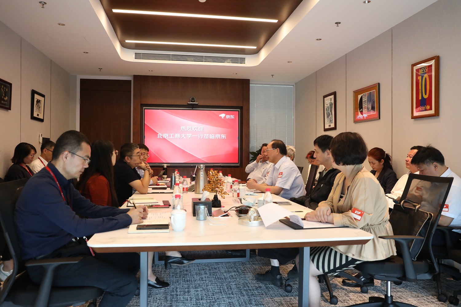 參觀結束后,雙方進行了座談交流。黨委書記黃先開就調研學習的安排作簡要說明,并詳細介紹了學校近年來的建設發展情況和當前學校的重點工作。他指出,近年來,學校在北京市委市政府的堅強領導和支持下,各項事業發展迅速,不斷邁上新的臺階,構建并形成了與具有商科、輕工和食品特色的高水平研究型大學相協調的一流學科體系。學校明確提出,要加快“雙一流”建設,舉全校之力推動食品科學與工程學科進入全國前三名、成為世界一流學科,同時,加速商科數字化轉型,滿足北京城市建設對“數字+商科”復合型創新人才的需要,進入全國一流經管學科行列。他表示,京東是知名大型民營企業,在零售等行業領域成果斐然。徐雷作為學校杰出校友代表,擔任京東集團首席執行官,母校為此感到驕傲。在學校改革發展的關鍵時期,希望雙方加強校企合作,借助京東零售、物流與消費數據的優勢,推動學校學科與科研實現跨越式發展,更好服務北京需求,也歡迎京東資深高管為學生提供多種形式的講座與實踐機會。