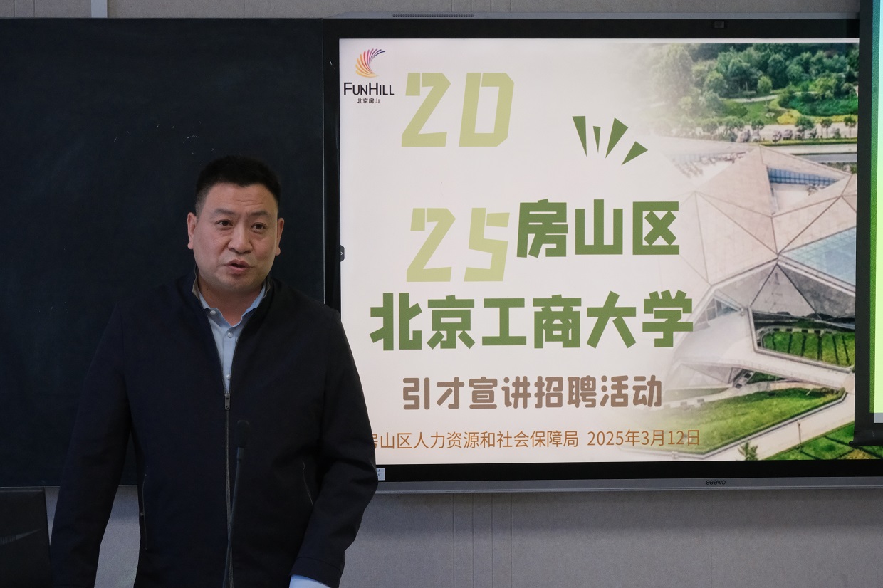 我校作為北京市首批大學生就業創業指導服務站建設試點單位,在房山區、門頭溝區、北京經濟技術開發區人力資源和社會保障局和良鄉大學城管委會的大力支持下,本次活動同步開啟 “人社局長進校園” 政策宣講首航。房山區人力社保局副局長劉佳用易懂的語言和詳實的數據,向畢業生講解了房山區域就業形勢、人才引進政策和產業發展機遇,并誠摯畢業生留在房山、扎根房山。門頭溝區人力社保局副局長張偉聚焦前沿產業集群,從人工智能應用場景、超高清數字視聽、心血管醫療器械三大產業領域,為畢業生講解門頭溝區就業前景和人才需求。房山村官服務科科長王革為畢業生精準解讀鄉村振興協理員政策,為有志服務基層的畢業生拓寬發展路徑。