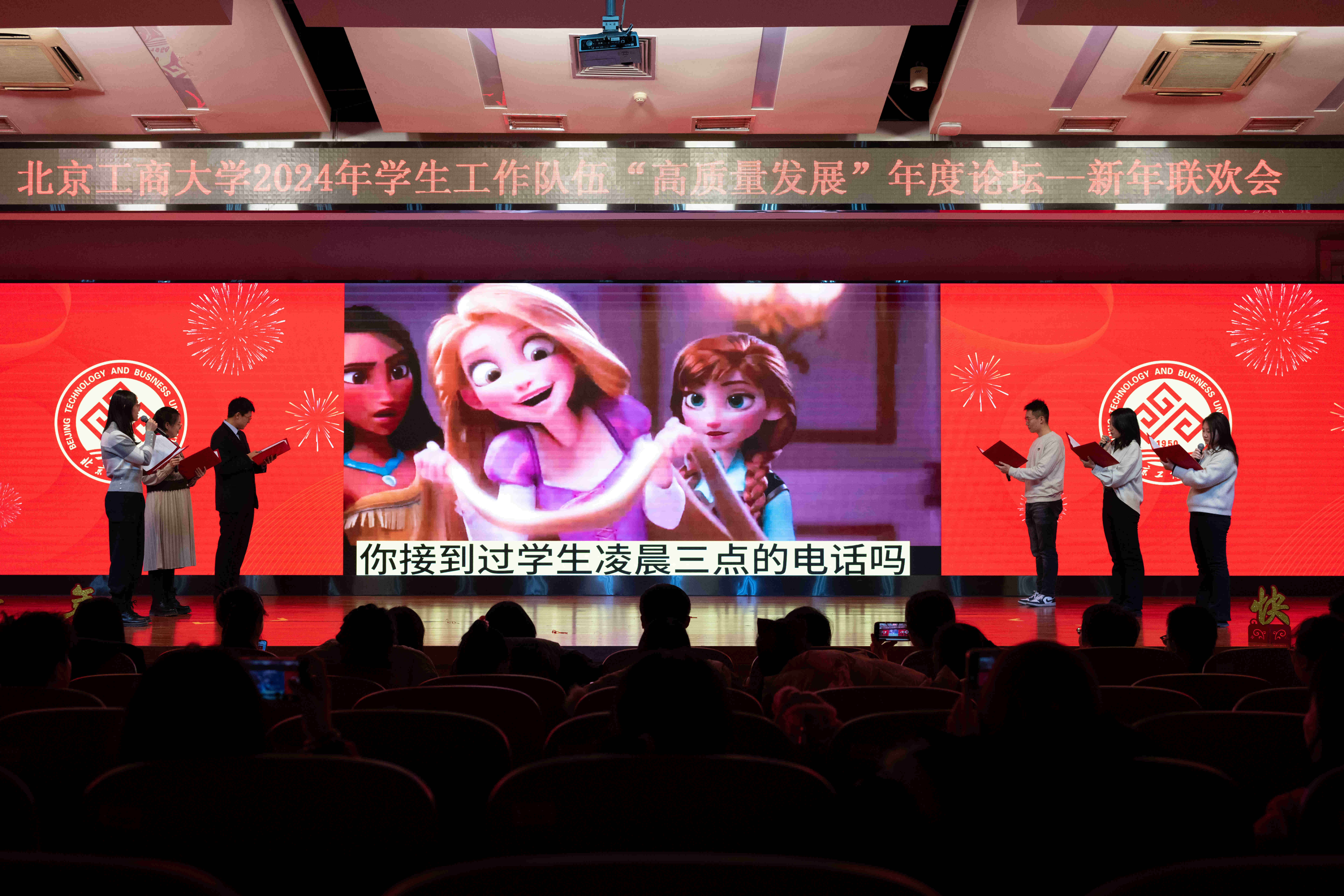 聯(lián)歡會以“龍行龘龘 欣欣學工”為主題,匯聚了由學工職能部門以及各學院精心編排的節(jié)目,輔導(dǎo)員老師們認真準備、發(fā)揮所長,通過歌曲、舞蹈、朗誦、配音等形式,將歡樂感人的氛圍推向一個又一個高潮,傾情展現(xiàn)出一場精彩紛呈的視聽盛宴。