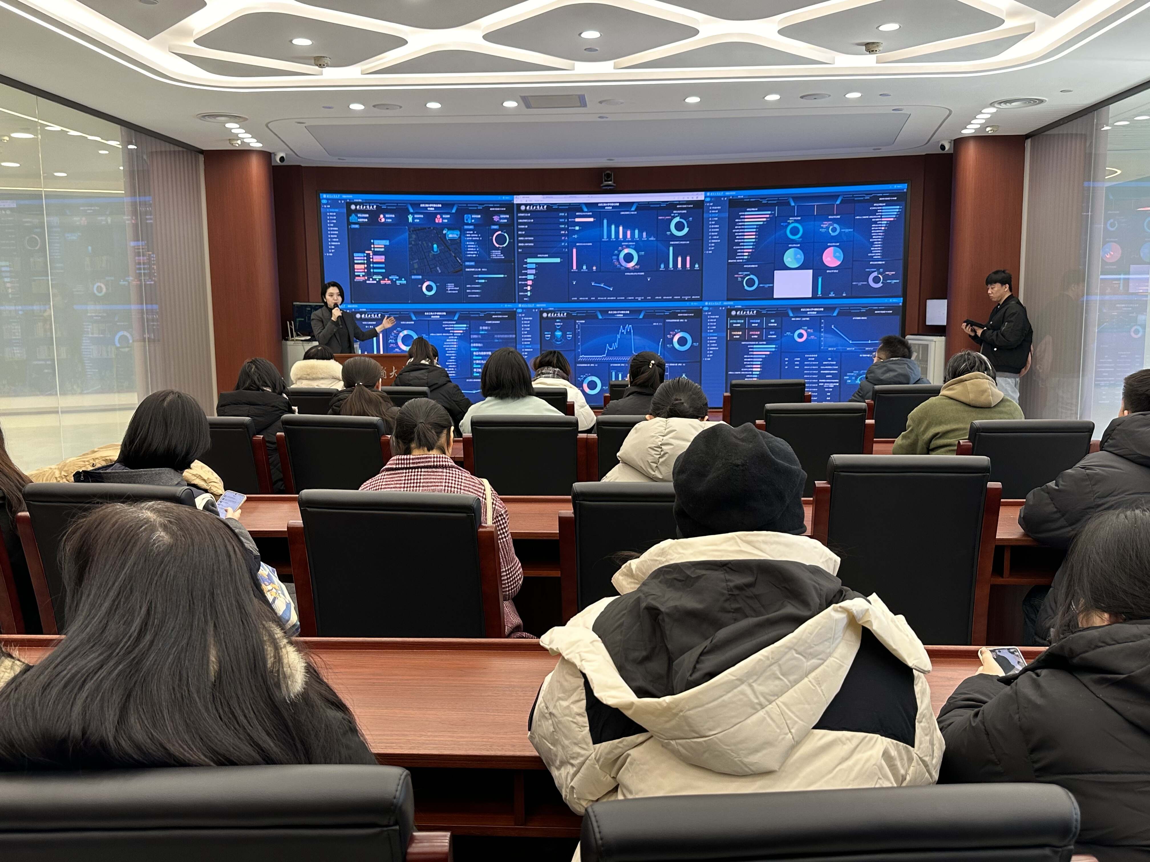 全體與會人員在數(shù)字未來中心副主任劉禹孜的帶領(lǐng)下,參觀了學校數(shù)字未來中心,大家聆聽了學校智慧教學一體化平臺建設(shè)情況介紹,現(xiàn)場觀摩了課程資源平臺、師生畫像、知識圖譜、校情概覽、數(shù)字底座等實際應(yīng)用,切身體驗了數(shù)字化、智能化對學校人才培養(yǎng)方式帶來的變革,對學校未來事業(yè)發(fā)展方向有了更為深刻的體會與認知。