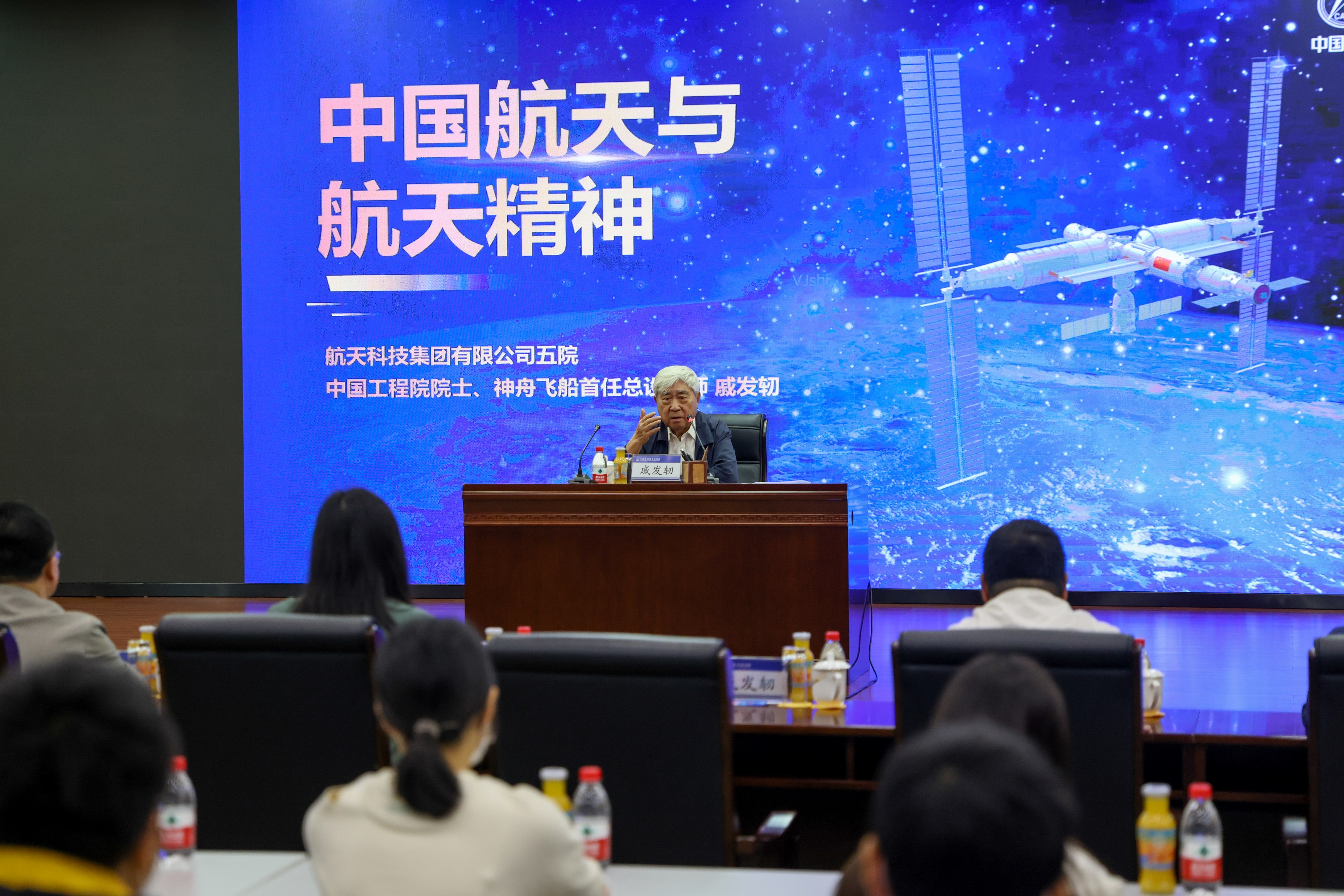 神舟一號到神舟五號總設計師、曾主持過東方紅一號到東方三號衛星研制的戚發軔院士給師生們上了一堂以《中國航天與航天精神》為主題的生動的愛國教育課。戚發軔院士從“什么是天,我國為什么要發展航天事業”講起,介紹了太空中的三種主要資源對我國發展的重要戰略意義。他介紹中國航天發展歷程,用親身的經歷和質樸有力的語言詮釋了“特別能吃苦、特別能戰斗、特別能攻關、特別能奉獻”的航天精神和“熱愛祖國、無私奉獻,自力更生、艱苦奮斗,大力協同、勇于登攀”的“兩彈一星”精神。他強調,青年學子要有一顆愛國心,要愛學習、愛專業、愛國家、愛民族;要仰望星空,腳踏實地,把愛國之心化為報國之行。現場學子用熱烈的掌聲對戚發軔院士表達了崇高的敬意。