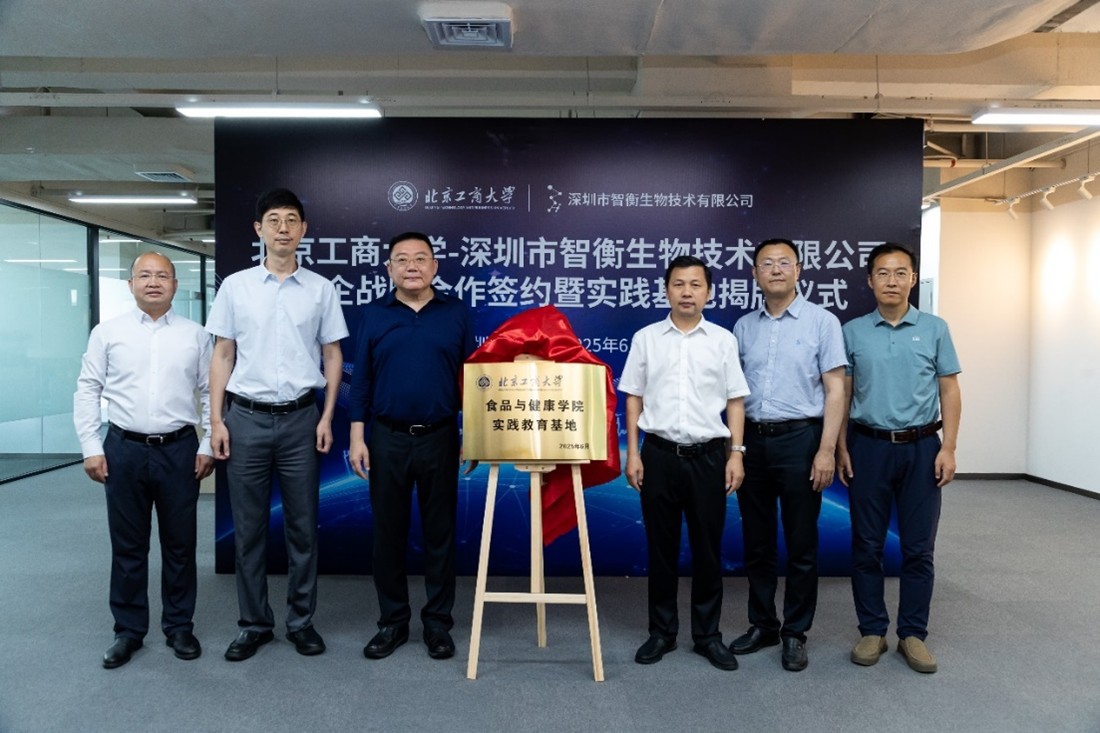 6月27日,黨委常委、副校長寇紅江帶隊赴深圳市光明區,出席北京工商大學-深圳市智衡生物技術有限公司校企戰略合作簽約暨實踐基地揭牌儀式。深圳市光明區科技創新局副局長莊園、深圳市藥品檢驗研究院副院長劉文亮、深圳市醫療器械檢測中心總工程師劉堯,深圳市智衡生物技術有限公司總經理劉衛東,北京工商大學食品與健康學院院長王彥波、食品風味與健康交叉創新研究院常務副院長劉野等,共同見證合作簽約與基地揭牌。