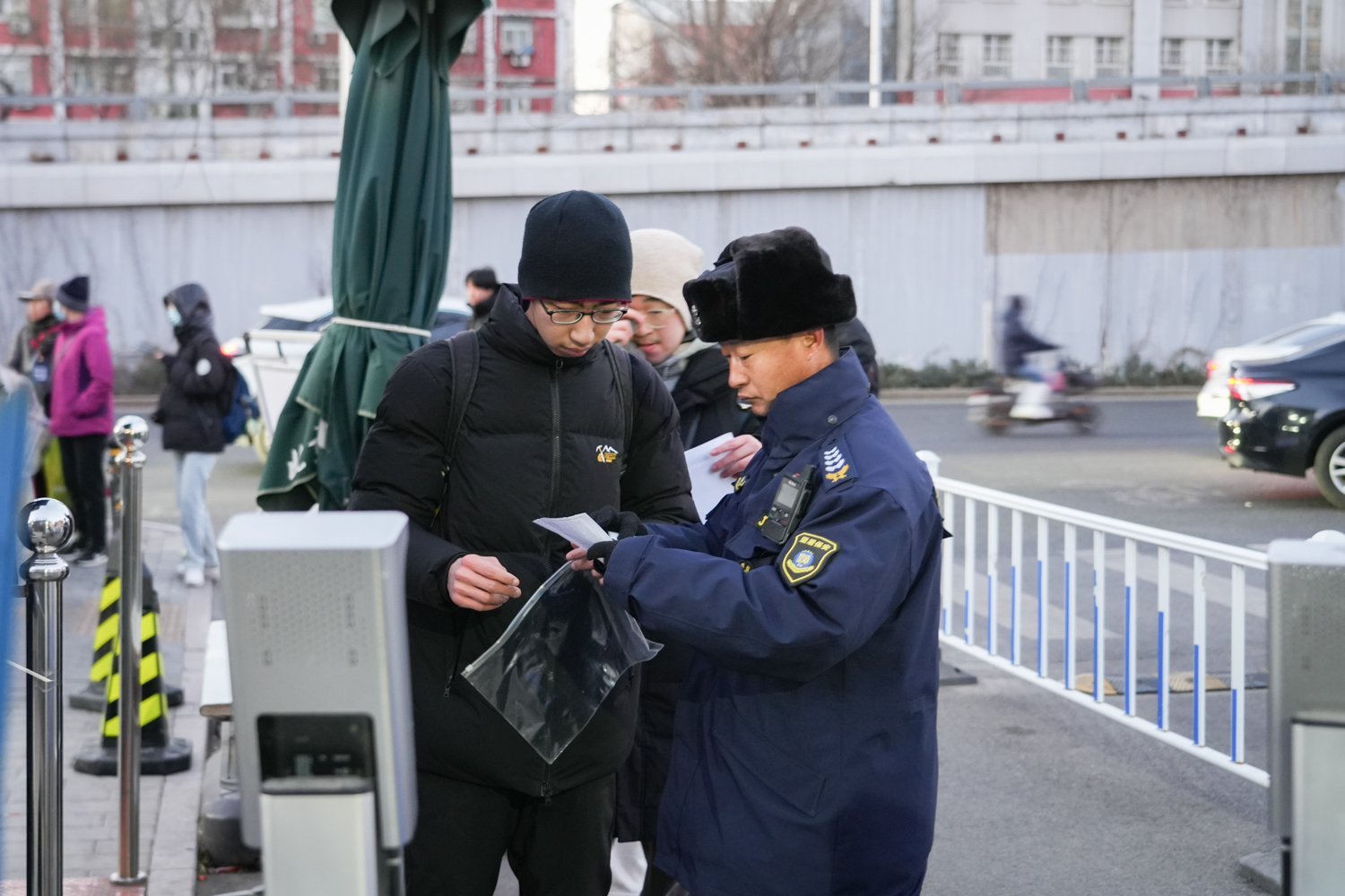 12月21日7時起,北京工商大學考點已有考生陸續到達,向工作人員出示準考證、身份證等憑證后入校,沿著提前劃定的考試封閉區域路線有序進入考場。從南門入校到存包安檢,再到踏入考場,路引標識處處可見,志愿者引導精準高效,每一個崗位、每一個環節都嚴格規范,確保考生安全平穩、快速順暢。