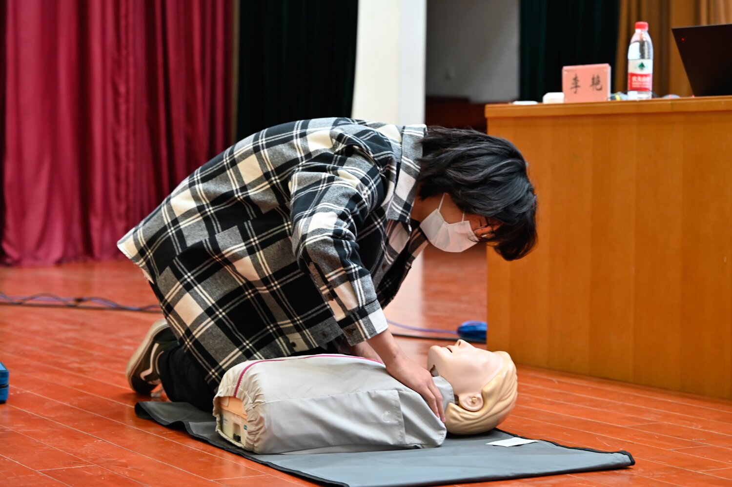 系統講解過后,陳爽上場向同學們完整演示心肺復蘇操作過程。為了使同學們更深入地了解流程,她現場邀請了6名同學上臺進行實操。在老師的引導下,同學們體驗了心肺復蘇的完整過程,并及時糾正了不規范的操作。李艷總結到,在進行心肺復蘇時,高質量和高效率是最重要的。