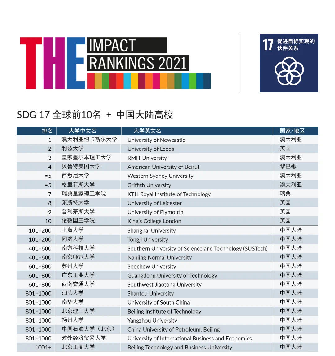 4月21日,泰晤士高等教育(THE)發布了2021年世界大學影響力排名。本次排名中,共有北京工商大學同上海大學、同濟大學、蘇州大學等19所中國大陸高校上榜。我校分別上榜總排名和3個SDG單項排名。