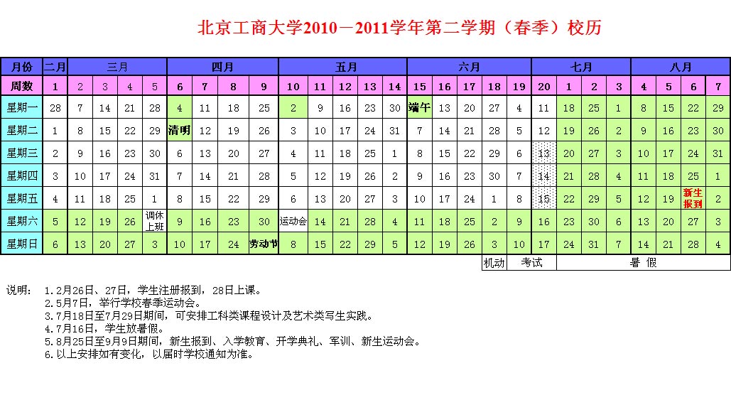 作者:北京工商大學2010-2011學年第二學期(春季)校歷