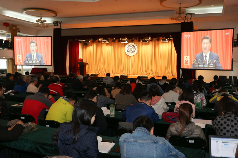 不到9點,學校在兩校區專門安排的收看大會開幕盛況會議室、教室、教師活動中心等收視點已經擠滿了前來收看的師生們。學校黨委理論中心組成員、黨委委員、紀委委員和機關黨委各支部的黨員、黨外知識分子、民主黨派代表、無黨派人士在阜成路校區三層報告廳共同收看了大會的實況轉播。會議室現場,大家聚精會神地聆聽習近平總書記的工作報告,認真地做著筆記,為報告精彩之處熱烈鼓掌。在阜成路校區教工活動中心、良鄉校區行政樓106會議室、文二樓403教室等集中收看地點,離退休黨員、教職工和學生們凝神貫注地收看大會,現場不時響起熱烈掌聲。