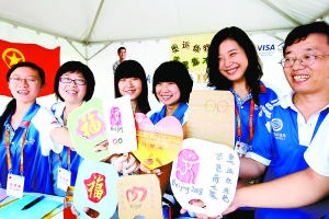昨天,北京工商大學嘉華學院奧運城市志愿者展示自制的“奧運扇”。這批畫有中國印、奧運五環等奧運元素的扇子,是志愿者們利用廢紙板制成。 本報記者 吳鏑攝