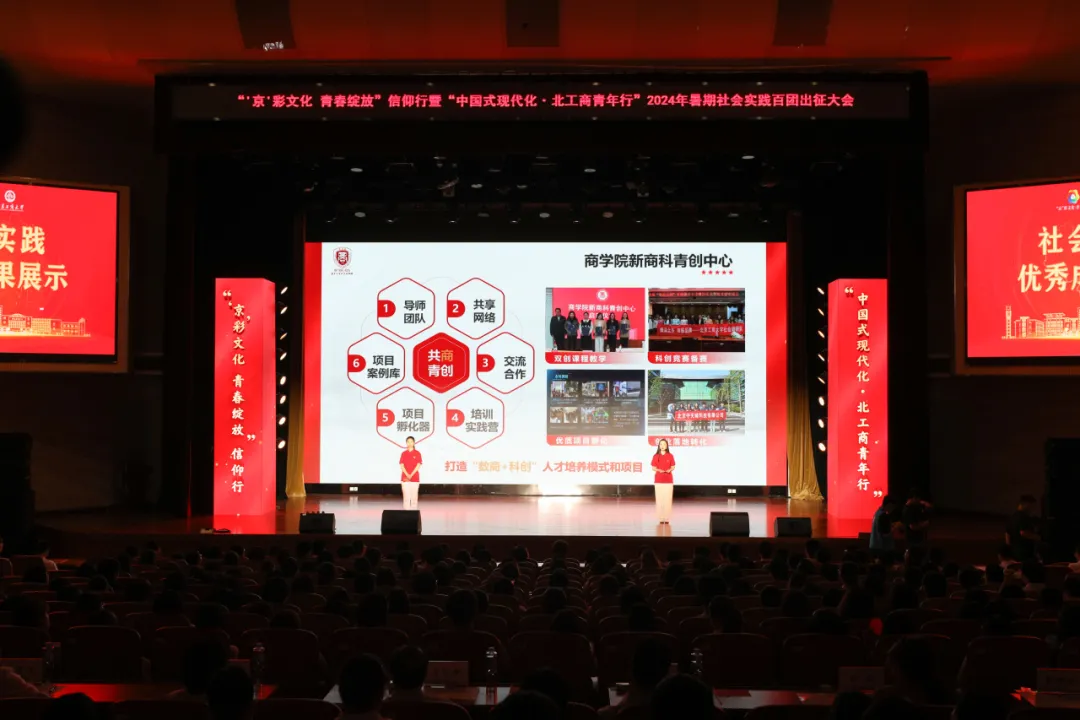 學(xué)校黨委書記黃先開,市社科院黨組成員、副院長、市委講師團(tuán)團(tuán)長肖峻峰,市委教育工委宣教處副處長丁貞棟,市委宣傳部理論處許倩,團(tuán)市委大學(xué)部副部長王曉鷗一同上臺,共同啟動(dòng)2024年“‘京’彩文化 青春綻放”信仰行暨“中國式現(xiàn)代化 北工商青年行”暑期社會(huì)實(shí)踐百團(tuán)出征!