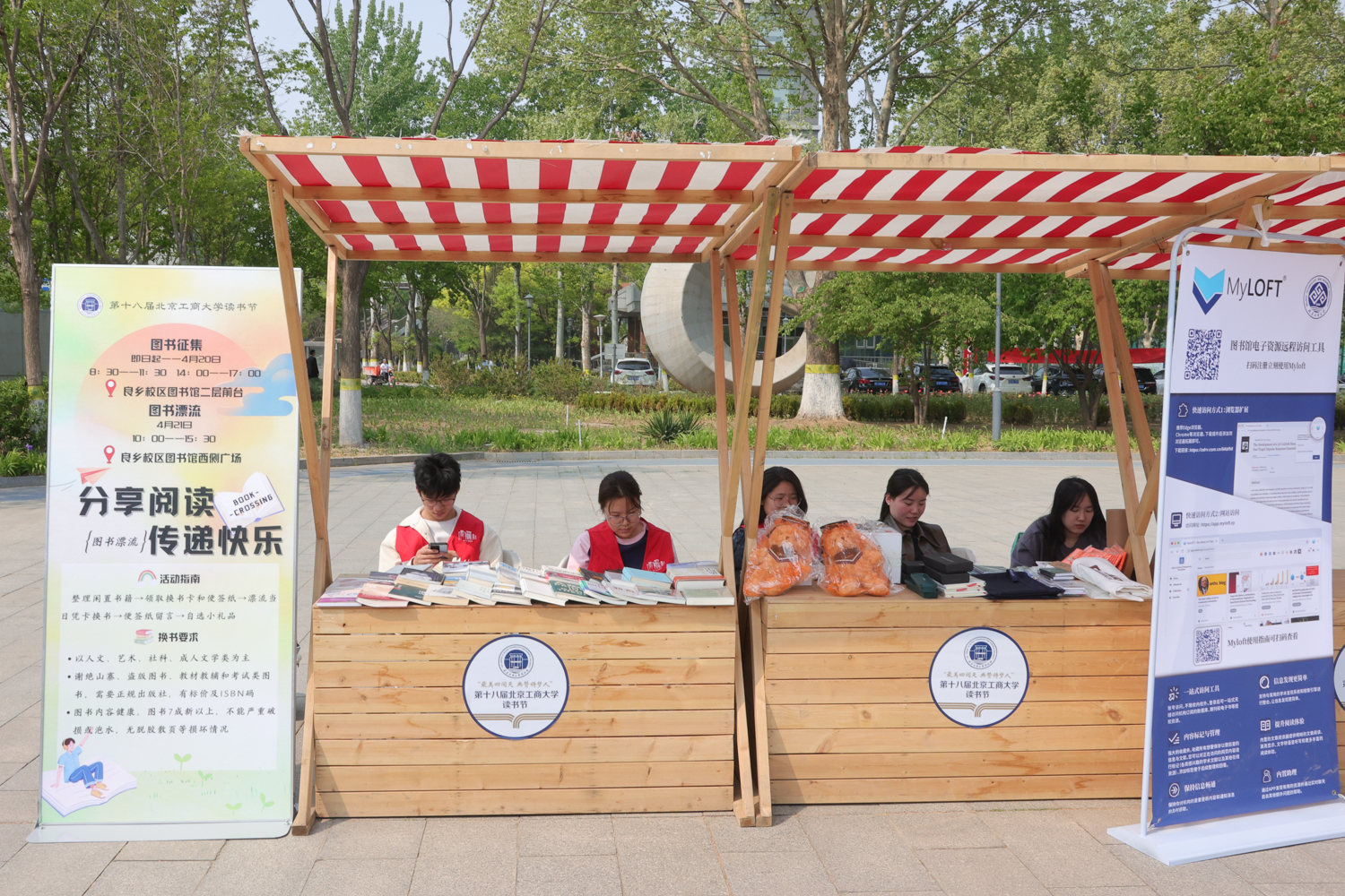 場館外,學校“最美四閱天 典贊筑夢人”第十八屆讀書節正在如火如荼展開。房山區文化活動中心與北京工商大學共同組織了“分享閱讀,交換快樂”第十四屆換書大集,師生可以將手中的舊書帶到活動攤位前“以舊換新”,各種類型的七百余冊經典圖書在手與手的傳遞間,真正實現了校地資源共享,建設書香校園。此外,還有“漂流詩韻”詩詞拼貼活動、為我喜愛的新時代偶像的點贊、“書名我來猜”趣味書名有獎競猜等活動,并為師生們準備了豐富的小禮物,活動現場熱鬧非凡。