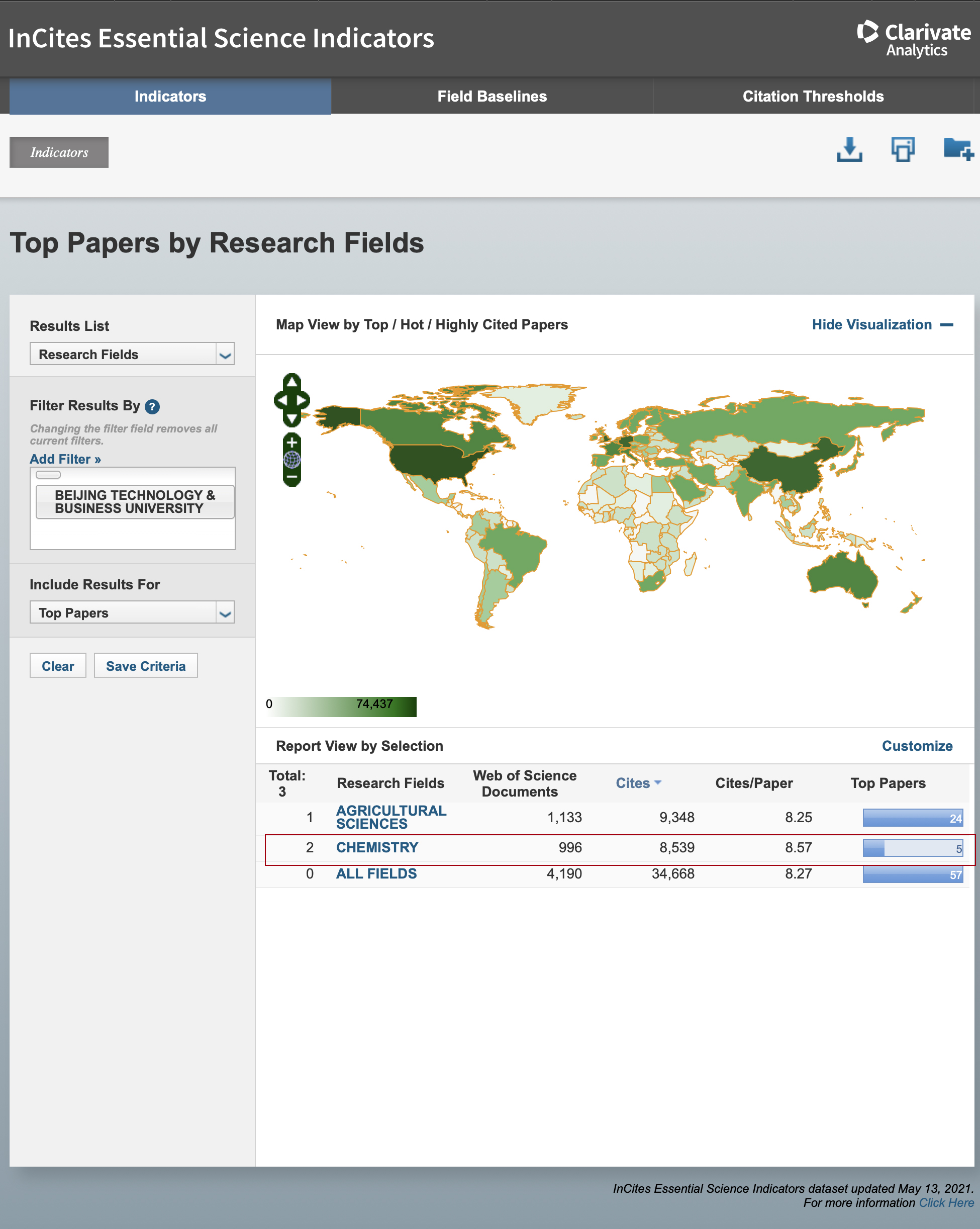 北京時間5月13日,科睿唯安(Clarivate Analytics)發布的最新一期ESI(Essential Science Indicators)數據顯示,我校“化學”(Chemistry)學科首次躋身ESI全球排名前1%,標志著我校化學學科達到世界一流水平。化學學科繼2019年農業科學學科首次進入ESI前1%之后,成為我校第二個進入ESI前1%的學科。
