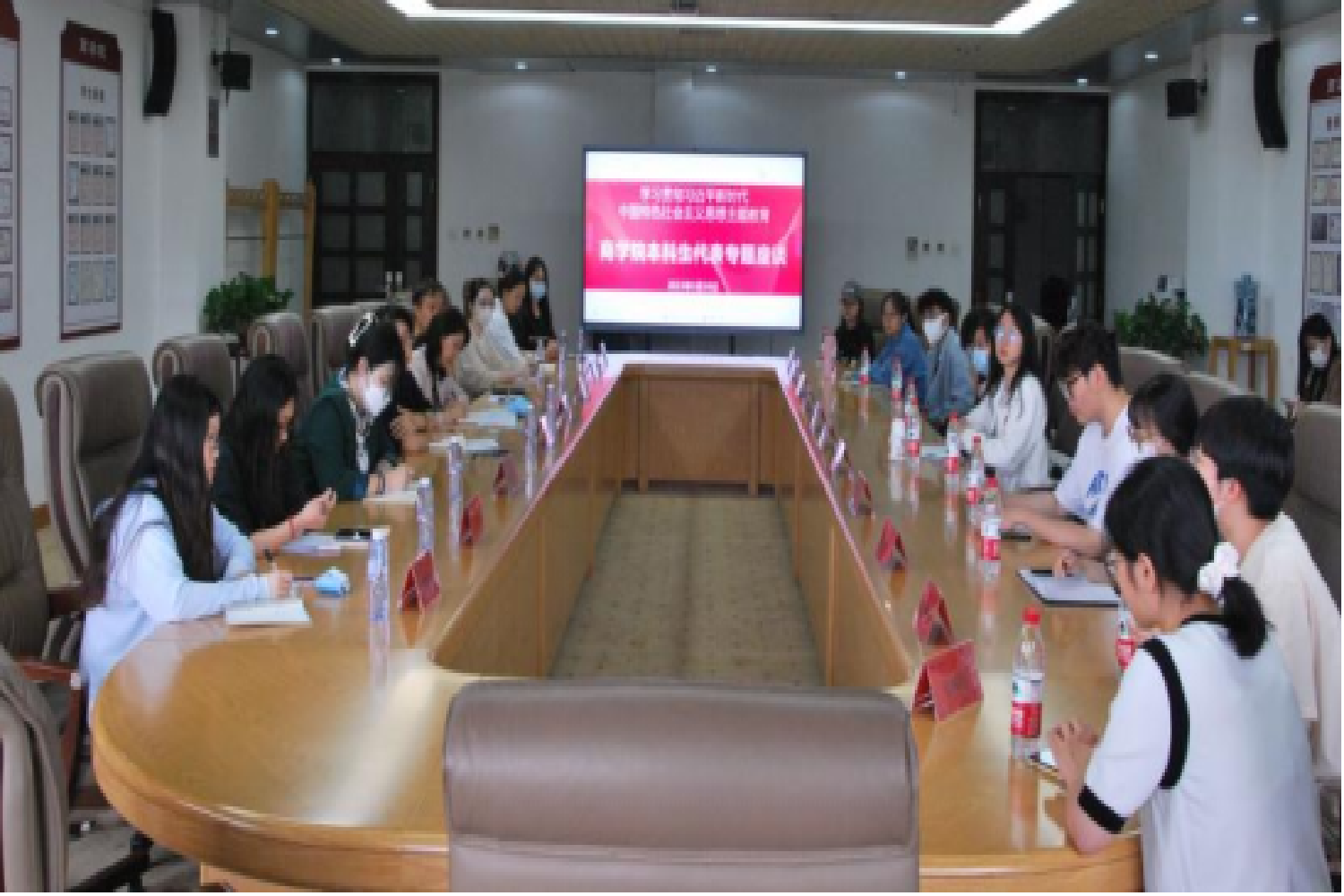 為切實將學習貫徹習近平新時代中國特色社會主義思想主題教育走深走實,用好專題調研,進一步掌握學生發展狀況及成長需求,服務青年學子成長成才,商學院于5月30日在良鄉主校區商學樓311會議室舉行本科學生代表專題座談會。學院黨委書記張春萍、副書記張倩、本科各年級輔導員及12名學生代表參會,參會學生覆蓋學生干部、學生黨員、少數民族學生代表等多個群體。