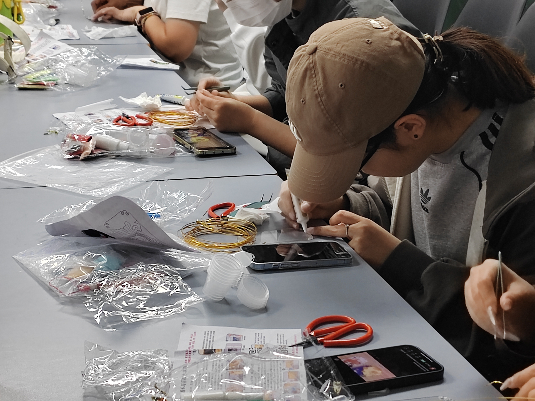 主持人介紹了掐絲琺瑯的歷史淵源和工藝特點,并逐步講解了書簽制作的步驟。同學們專注地用鑷子進行掐絲,小心翼翼地將線稿圖案粘貼在書簽上,聚精會神地填充彩砂,在光影交錯間感受傳統工藝的精細與嚴謹。經濟學院田同學表示:“親手制作出的這件書簽,不僅僅是一份紀念品,更是一段文化記憶的載體。希望未來能有更多這樣的機會,讓我們在忙碌的學習生活中,能靜下心來與傳統對話。”