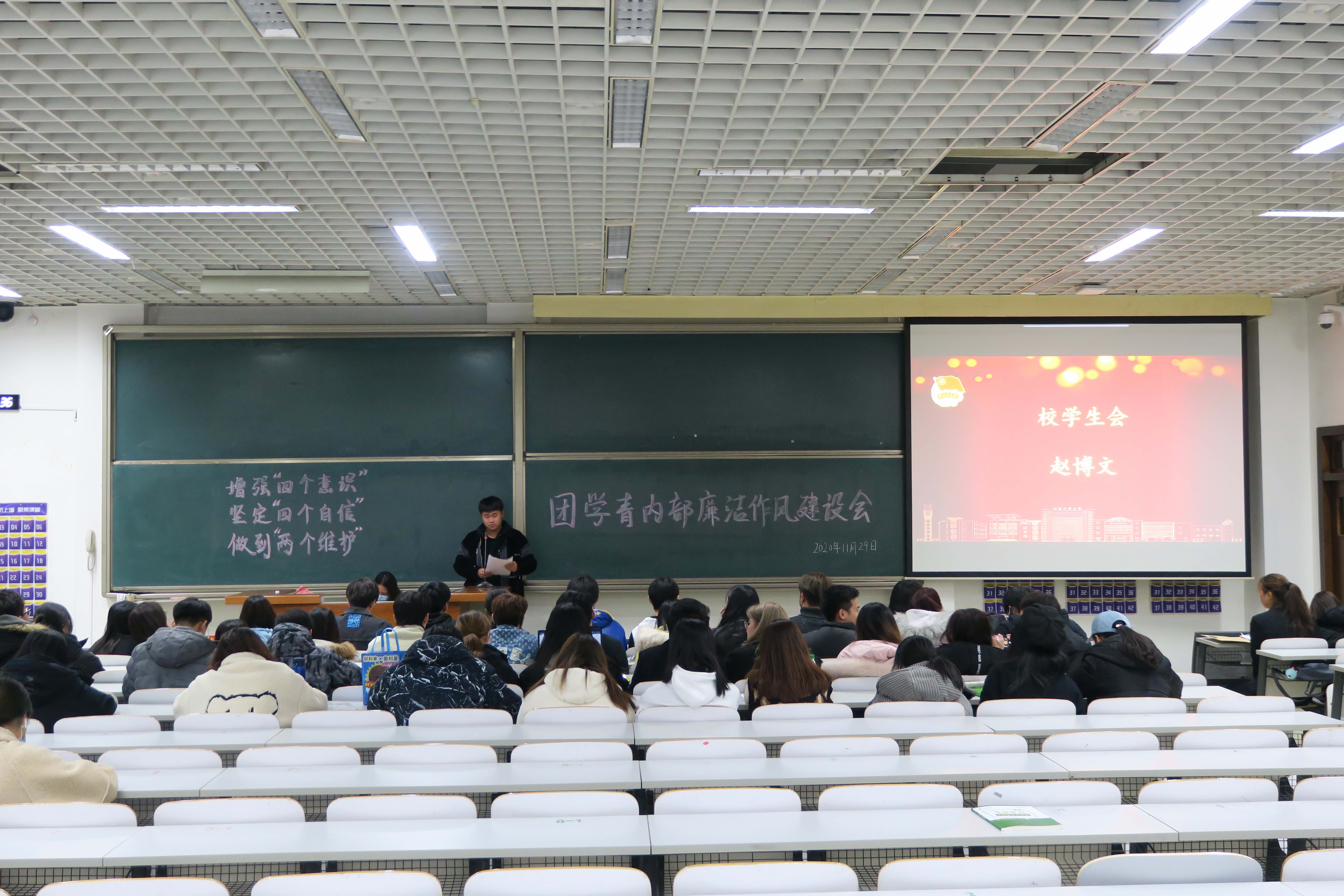 本次廉潔作風(fēng)建設(shè)會(huì)以習(xí)近平新時(shí)代中國特色社會(huì)主義思想為指導(dǎo),以學(xué)校2020黨建作風(fēng)建設(shè)年為契機(jī),依據(jù)學(xué)校黨委《關(guān)于印發(fā)<北京工商大學(xué)黨風(fēng)廉政宣傳教育聯(lián)席會(huì)議制度>》文件精神,結(jié)合我校2020年十大重點(diǎn)工作任務(wù)的安排部署,旨在營造以廉為榮、以腐為恥的校園文化氛圍,堅(jiān)定廣大學(xué)生干部廉潔自律的理想信念,培養(yǎng)正確、積極的價(jià)值體系和社會(huì)責(zé)任感。本次建設(shè)會(huì)以“堅(jiān)決倡導(dǎo)廉潔之風(fēng),堅(jiān)定樹立廉潔之氣,引領(lǐng)新時(shí)期大學(xué)生核心價(jià)值體系建設(shè)”為主題,引導(dǎo)學(xué)生干部深刻認(rèn)識(shí)到忠誠、廉潔、自律、有擔(dān)當(dāng)是作風(fēng)建設(shè)的重要內(nèi)容,學(xué)生干部不僅要具備較強(qiáng)的個(gè)人能力與協(xié)作能力,還要具備過硬的政治素質(zhì),做勤學(xué)思踐、廉潔忠誠,守初心、擔(dān)使命的學(xué)生模范。
