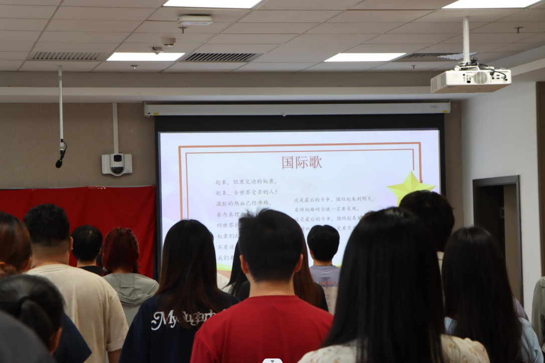 新老黨員共同合唱國際歌,集體宣誓儀式在雄壯的國際歌聲中結(jié)束。