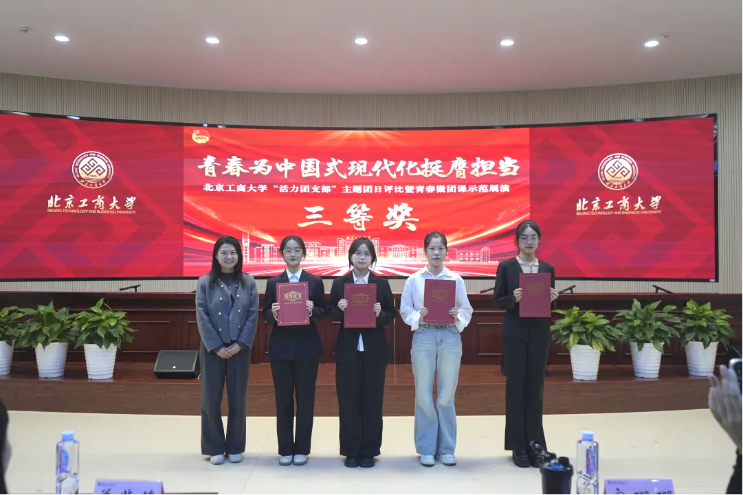 北京中醫藥大學團委書記宋珊珊為一等獎獲獎支部代表頒獎。獲獎支部為:輕工科學與工程學院環境工程231團支部、計算機與人工智能學院自動222團支部、商學院注會222團支部。