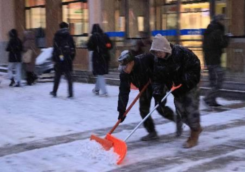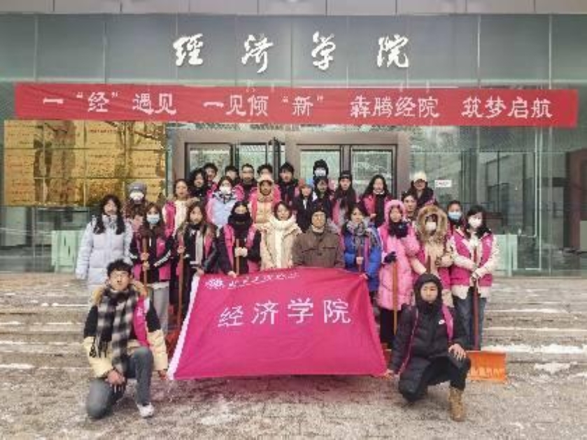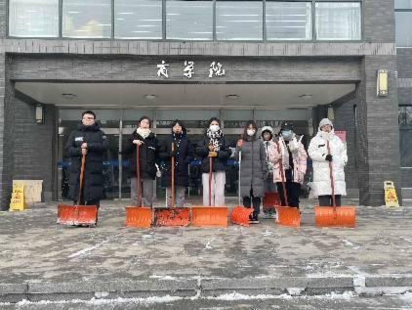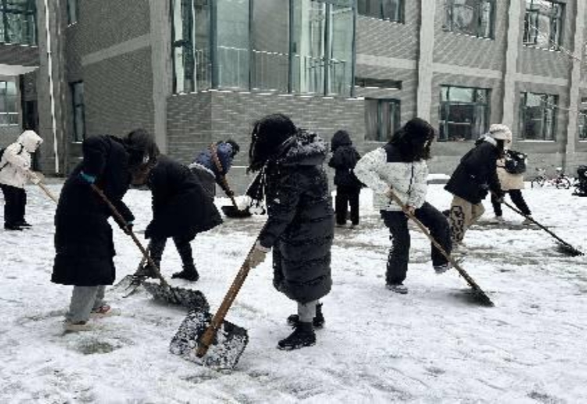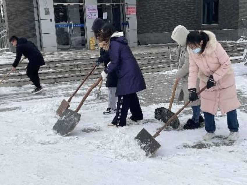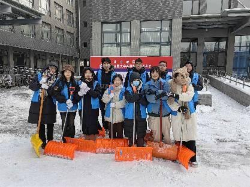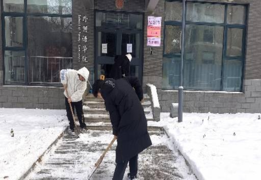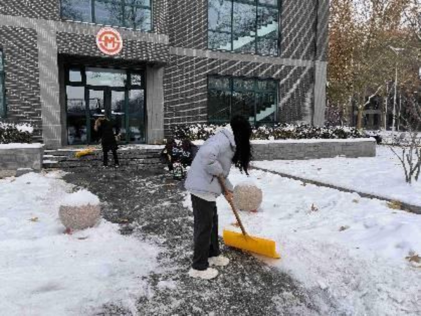 在學院的帶領下,學生志愿者也積極行動起來,開展掃雪除冰勞動實踐。學生們拿起除雪工具,推、鏟、揚、堆,各種方法齊上陣,有條不紊地將學院樓宇門口和道路上積雪路面逐一清理干凈,讓青春閃耀在冰雪世界,將愛與溫暖傳遞在校園的每個角落。