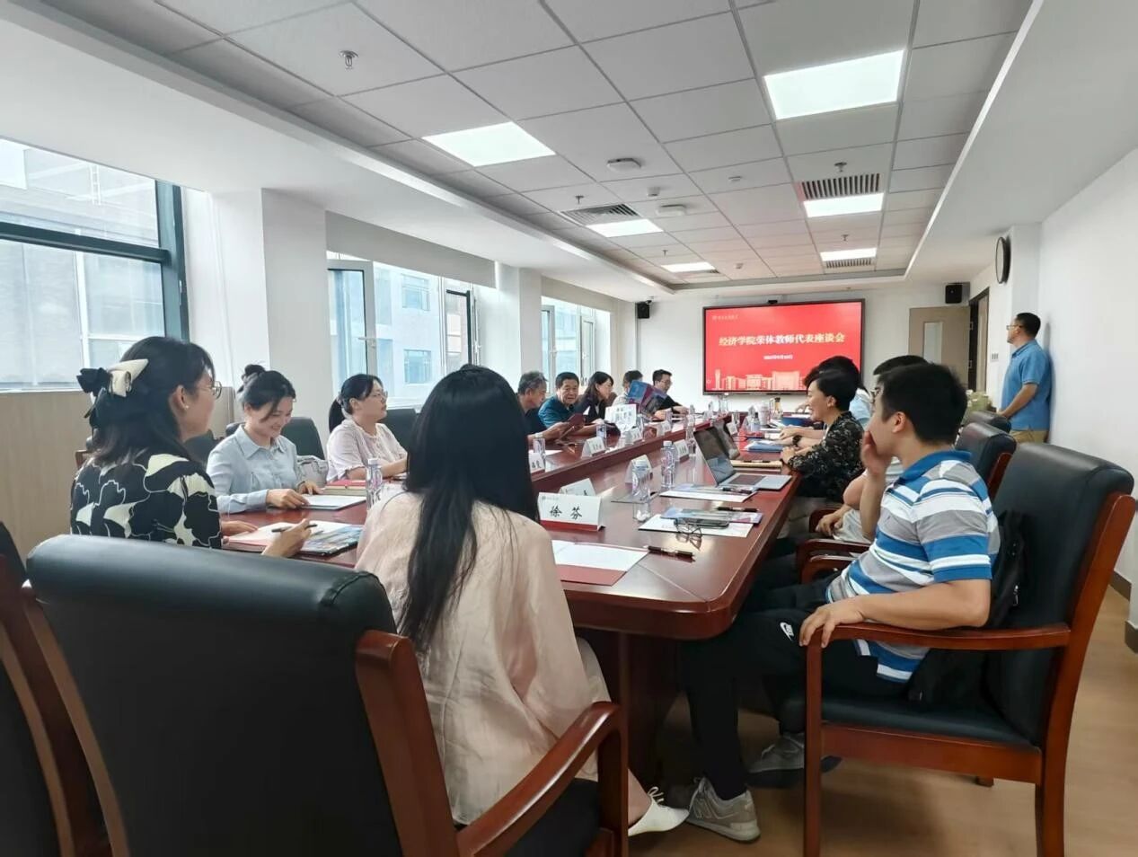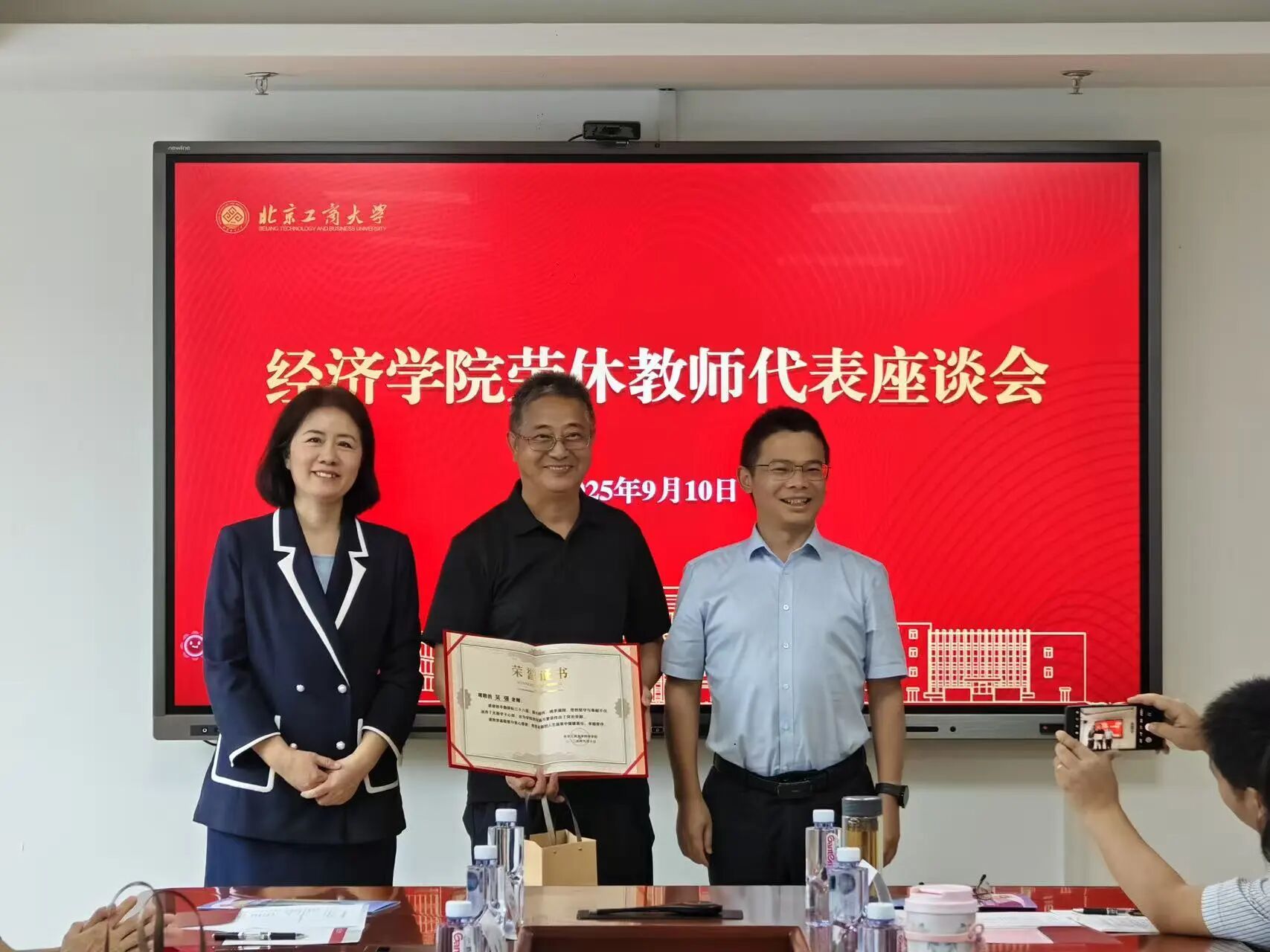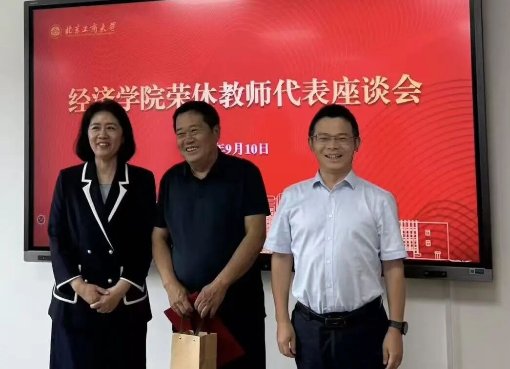 感恩奉獻,致敬芳華。在第 41 個教師節來臨之際,9月10日下午,經濟學院在良鄉校區學院會議室召開2025年榮休教師座談會,向為學院發展傾注畢生心血的榮休教師致以節日的問候與崇高的敬意。2025年榮休教師代表楊德勇、栗書茵、馬乃云、吳強、潘宏,學院黨委書記張春萍,執行院長詹新宇,副書記李艷春,副院長牛曉燕、許敬軒、馬雪嬌,中青年教師代表郭娜、張正平、鄧磊、徐芬及新入職教師參加座談會。會議由馬雪嬌主持。