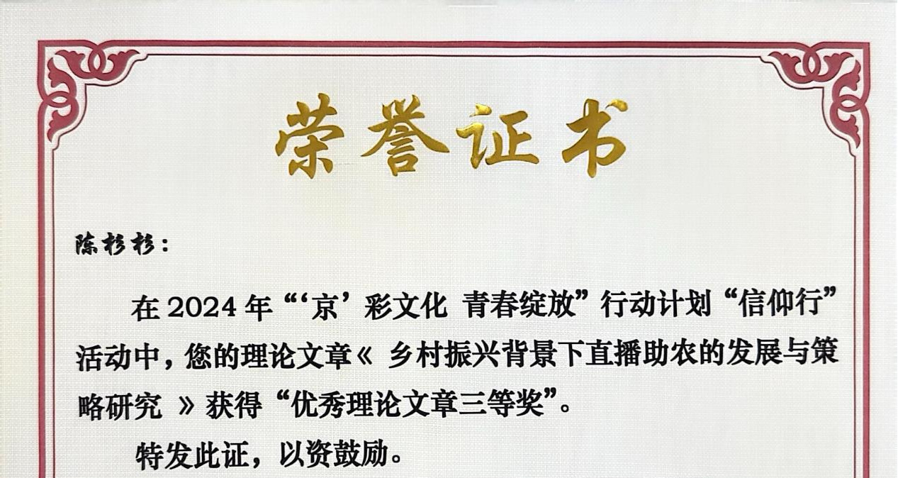 近日,由市委宣傳部、市委教育工委、北京市社會科學院(市委講師團)聯合主辦的“‘京’彩文化 青春綻放”行動計劃之“信仰行”2024年總結2025年工作部署會公布系列活動評獎結果,我校獲得多個獎項。