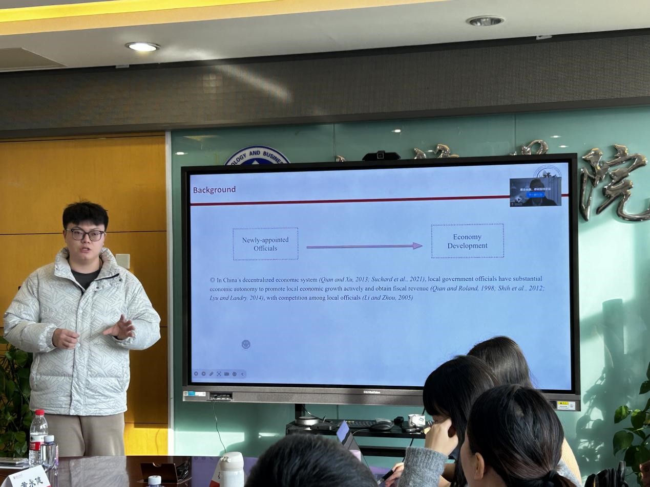 1月11日,北京工商大學(xué)經(jīng)濟(jì)學(xué)院2025年國(guó)際青年學(xué)者論壇在阜成路校區(qū)舉辦。來(lái)自北京大學(xué)、南開(kāi)大學(xué)、中國(guó)財(cái)政科學(xué)研究院、中國(guó)人民大學(xué)和中央財(cái)經(jīng)大學(xué)的13位優(yōu)秀青年學(xué)者參加本次論壇。經(jīng)濟(jì)學(xué)院執(zhí)行院長(zhǎng)詹新宇教授、副院長(zhǎng)許敬軒教授、科學(xué)研究院人文社科處副處長(zhǎng)、經(jīng)濟(jì)學(xué)院金融系副教授岳鵬鵬、經(jīng)濟(jì)學(xué)院經(jīng)濟(jì)系系主任陳真玲教授、貿(mào)經(jīng)系周珺副教授、國(guó)貿(mào)易系李靜老師和經(jīng)濟(jì)系歐佳佳老師參加論壇研討活動(dòng)。