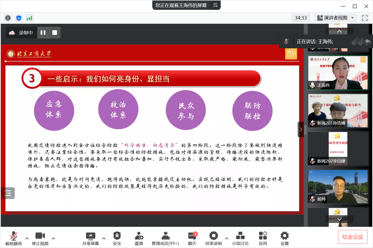 王海偉以《疫情下新時代青年的使命與擔當》為題,從目前疫情防控整體形勢分析出發(fā),圍繞疫情防控中的一些記憶、對比、啟示與思考等四個方面講授。她表示新冠病毒疫情防控攻堅戰(zhàn)是一場現實的思政課,一堂鮮活深刻的思政課,也是一堂難忘的思政課。她帶領師生共同回顧了疫情防控以來學院師生主動投身校內外抗擊疫情的生動事跡,充分彰顯了學院師生黨員的責任與擔當。提醒師生居家學習工作期間保護好自己和家人,呼吁師生們要堅定信心,自覺在思想上、政治上、行動上與黨中央保持高度一致。通過與國外抗疫數據對比,指出我國動態(tài)清零的疫情防控政策,最大限度的保護了人民群眾人身財產安全,是人民至上,生命至上的最好詮釋,體現了黨始終把為中國人民謀幸福,為中華民族謀復興作為自己的初心使命,充分彰顯了黨領導的政治優(yōu)勢和中國特色社會主義制度的顯著優(yōu)勢。