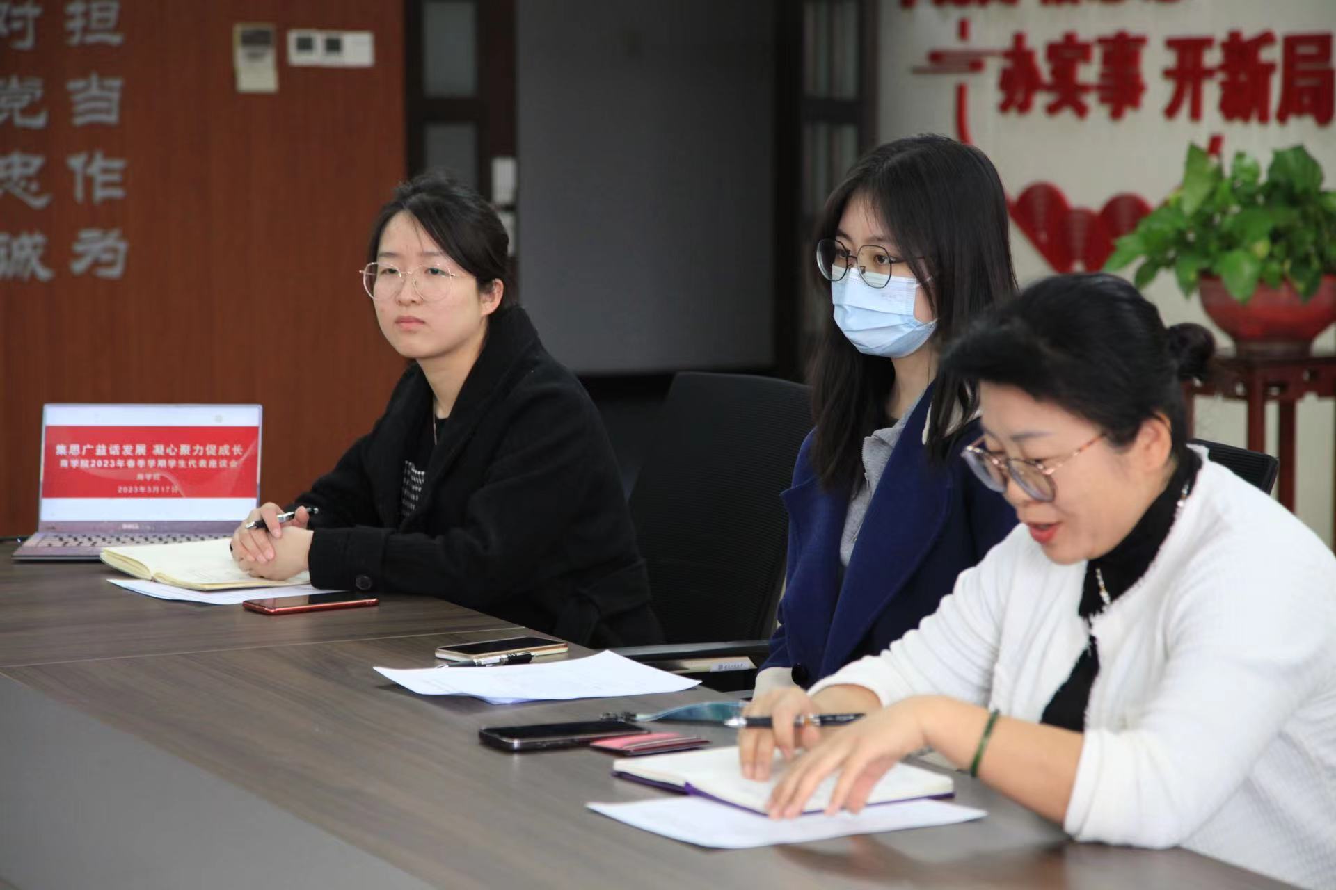 為切實把握學生所需所想和急難愁盼,引導學生做好發展規劃,力促形成優良學風,商學院于3月17日中午12:30以“集思廣益話發展 凝心聚力促成長”為主題舉行本科學生代表座談交流會。學院黨委副書記張倩、輔導員杜美涵、王琳菲、程鈺以及10名各年級學生代表參會,會議由輔導員趙春燕主持。