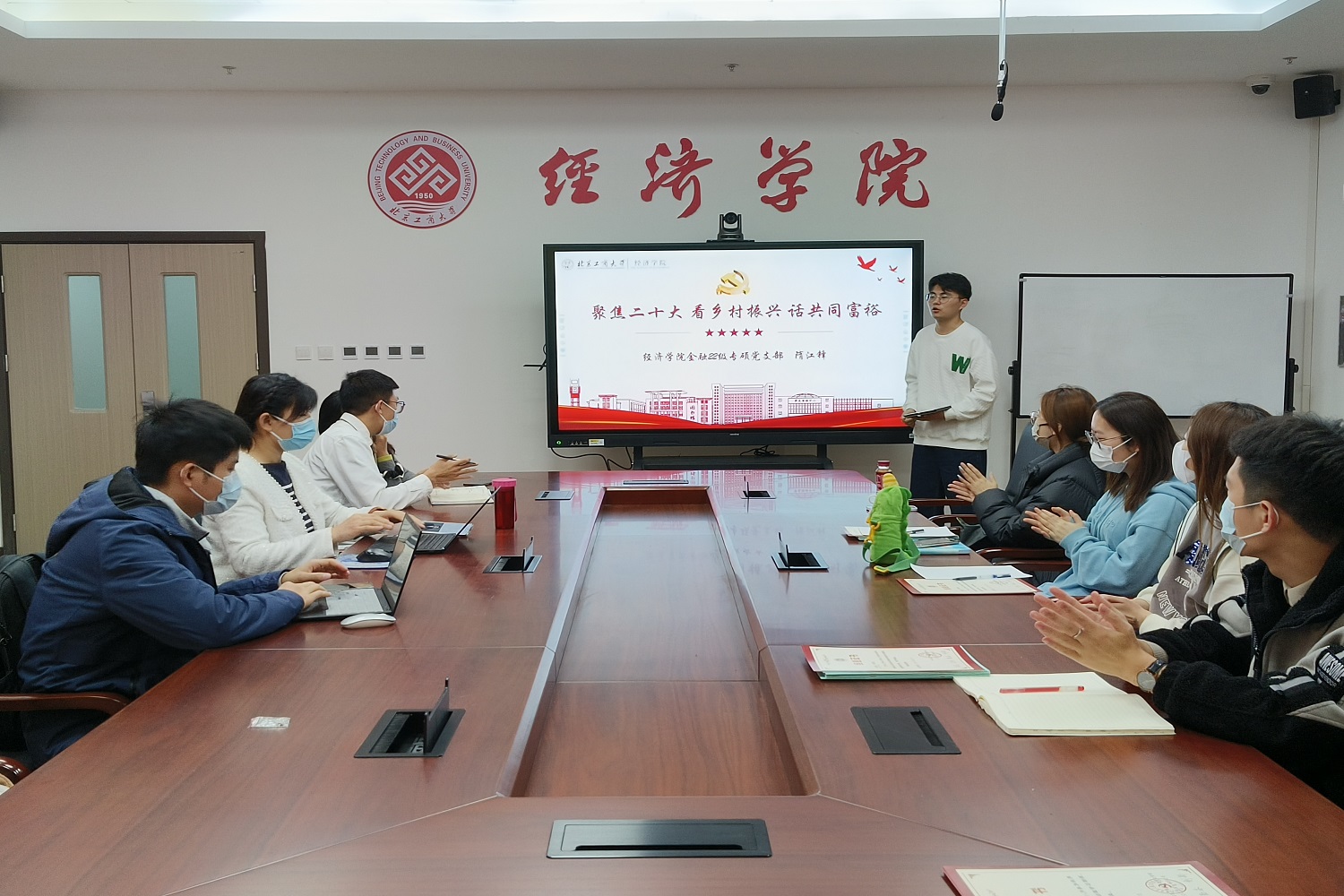 經濟學院金融22級黨支部書記隋江鋒同志從鄉村振興微故事、普惠金融對鄉村振興和共同富裕的促進以及青年在推進共同富裕中的責任與擔當三個方面做出主題為 “聚焦二十大 看鄉村振興 話共同富裕”的專題匯報。首先通過視頻短片方式向大家介紹了帶領廟荒村黨員群眾一起譜寫村子壯麗發展新篇章的河南省安陽市林州市黃華鎮黨支部書記郁林英同志的鄉村振興故事。隨后解釋了共同富裕與鄉村振興之間的內在關系,并結合自身學科知識對普惠金融促進共同富裕機理進行分析。最后,隋江鋒同志對推進共同富裕做出了作為新時代青年黨員的理解,他認為打江山容易守江山難,青年黨員要明確自己在推進共同富裕中的責任與擔當,志存高遠,應腳踏實地,應開拓創新,順應時代要求,尋找更好地解決問題的思路。