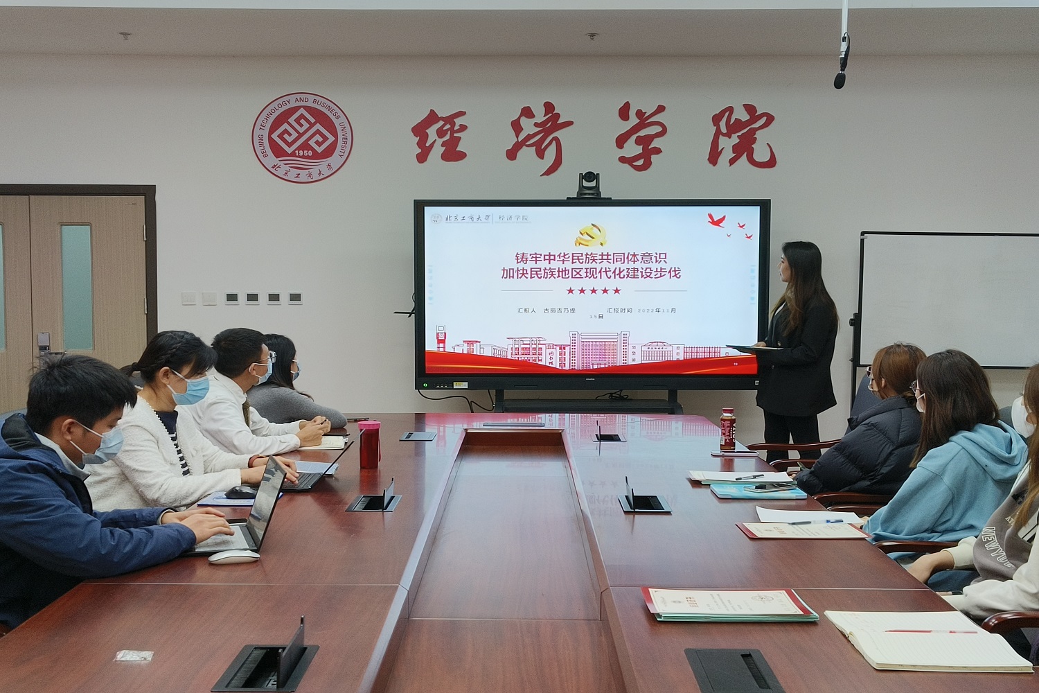 經濟學院稅務22級黨支部書記古麗吉乃提向大家做出“筑牢民族共同體意識 加快民族地區現代化建設步伐”的專題匯報。古麗吉乃提同志首先解釋了民族地區現代化建設的內涵,強調了民族地區現代化建設的重要性。隨后通過圖片和視頻結合的方式從教育、醫療、社會保障、居住條件和環境五個方面向大家展示了民族地區現代化建設成效。通過西藏教育發展歷程以及“五代房背后的故事”等真實事跡的講述,在座的黨員同志感受到民族地區現代化建設的斐然成就。最后古麗吉乃提總結民族地區現代化建設經驗,提出通過“一帶一路”倡議發揮民族地區在國家構建開放型經濟新體制中的綜合優勢以及通過強化生態安全屏障定位凸顯民族地區綠色資源的戰略性供給能力等方面繼續以中國特色社會主義現代化引領民族地區現代化。
